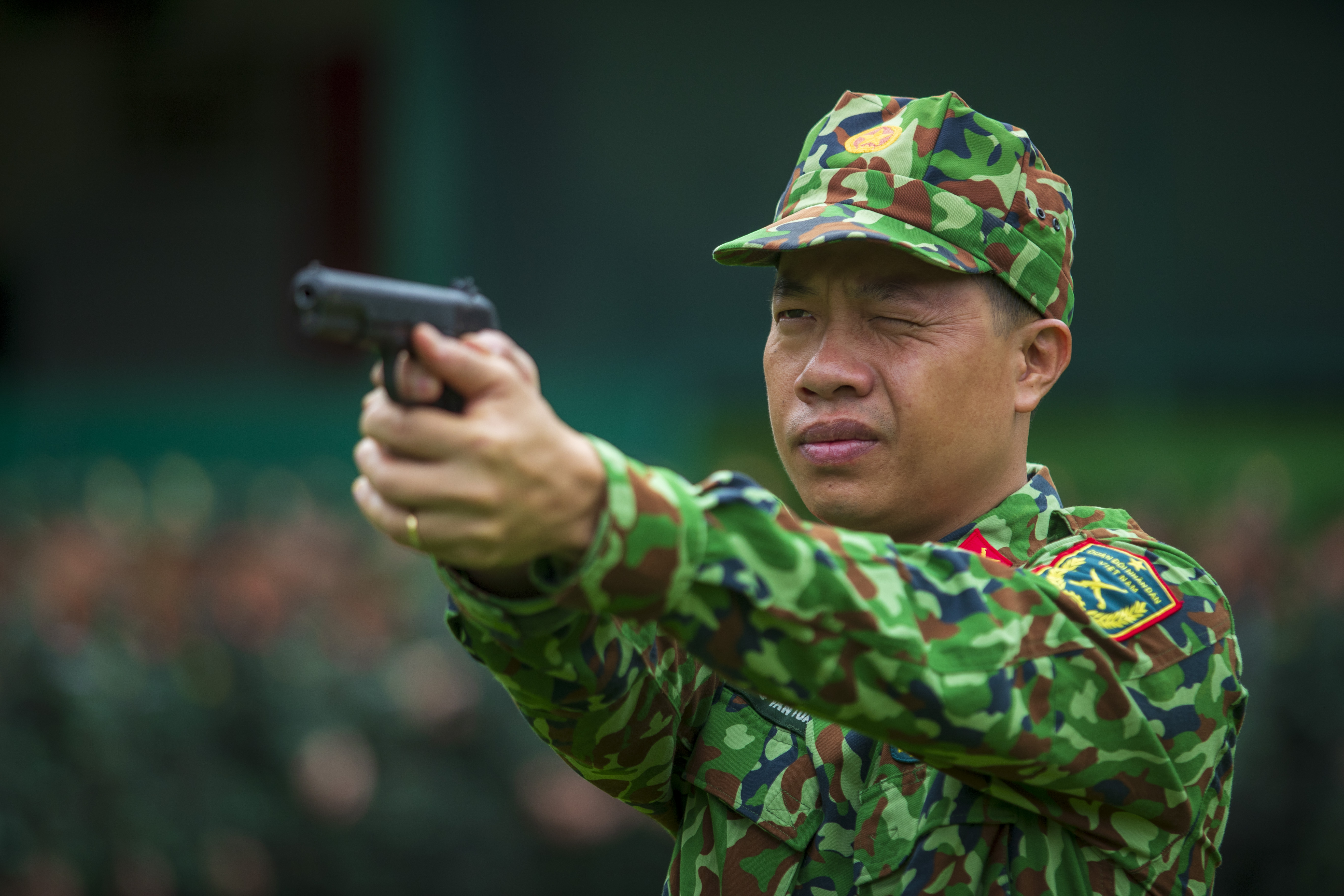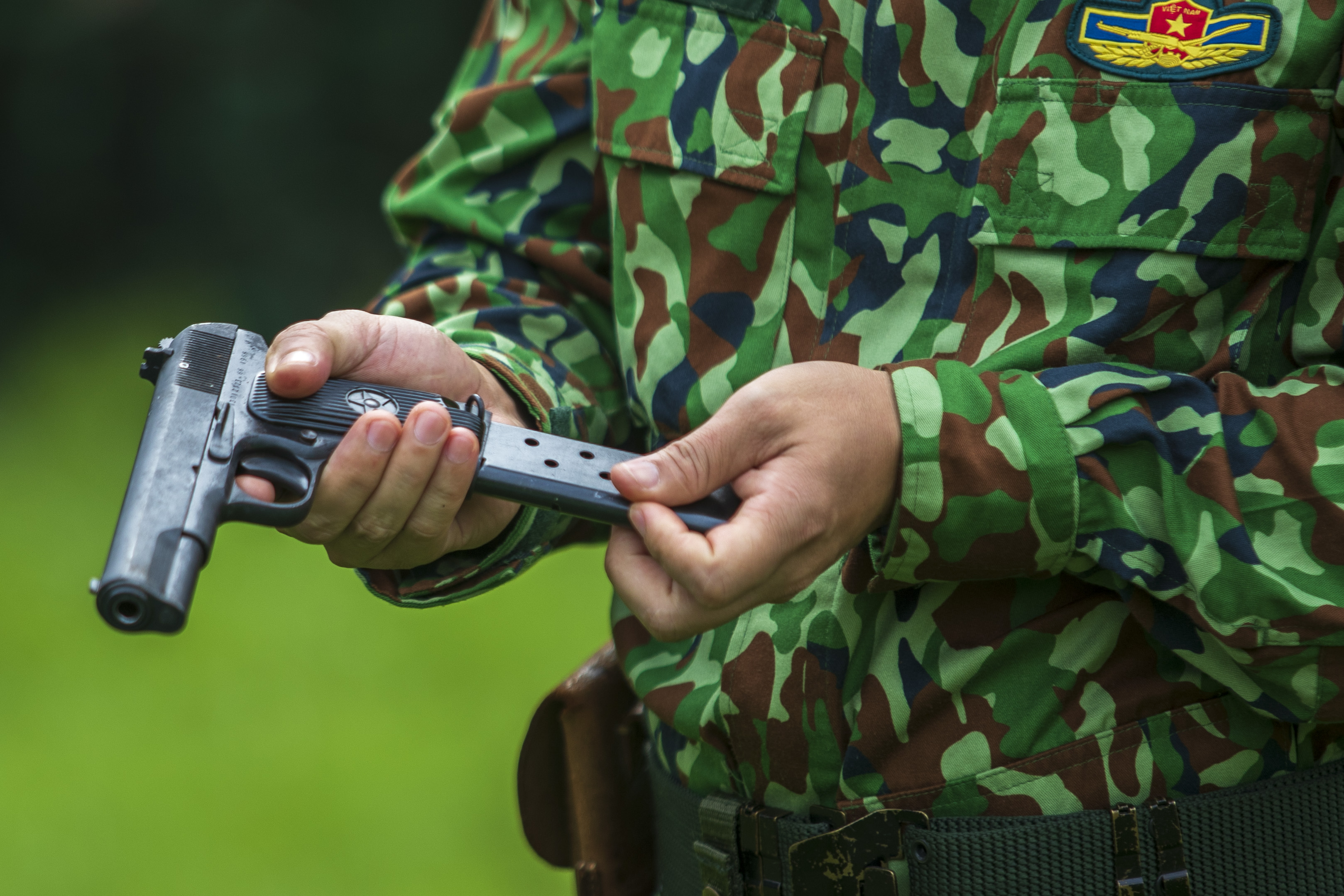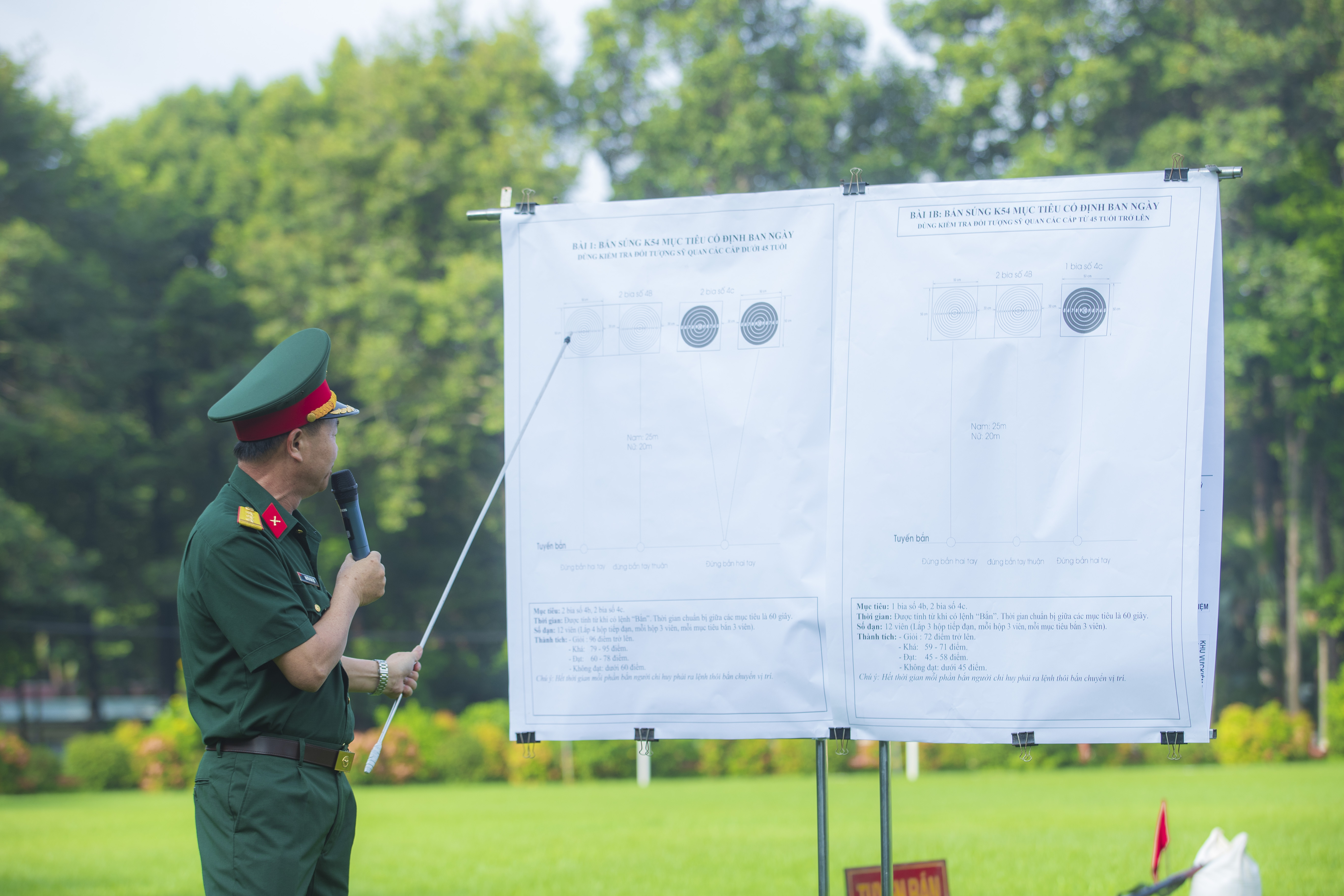 Cán bộ Phòng Quân huấn nhà trường tập huấn kỹ thuật ngắm và cơ chế vận hành súng ngắn K54.