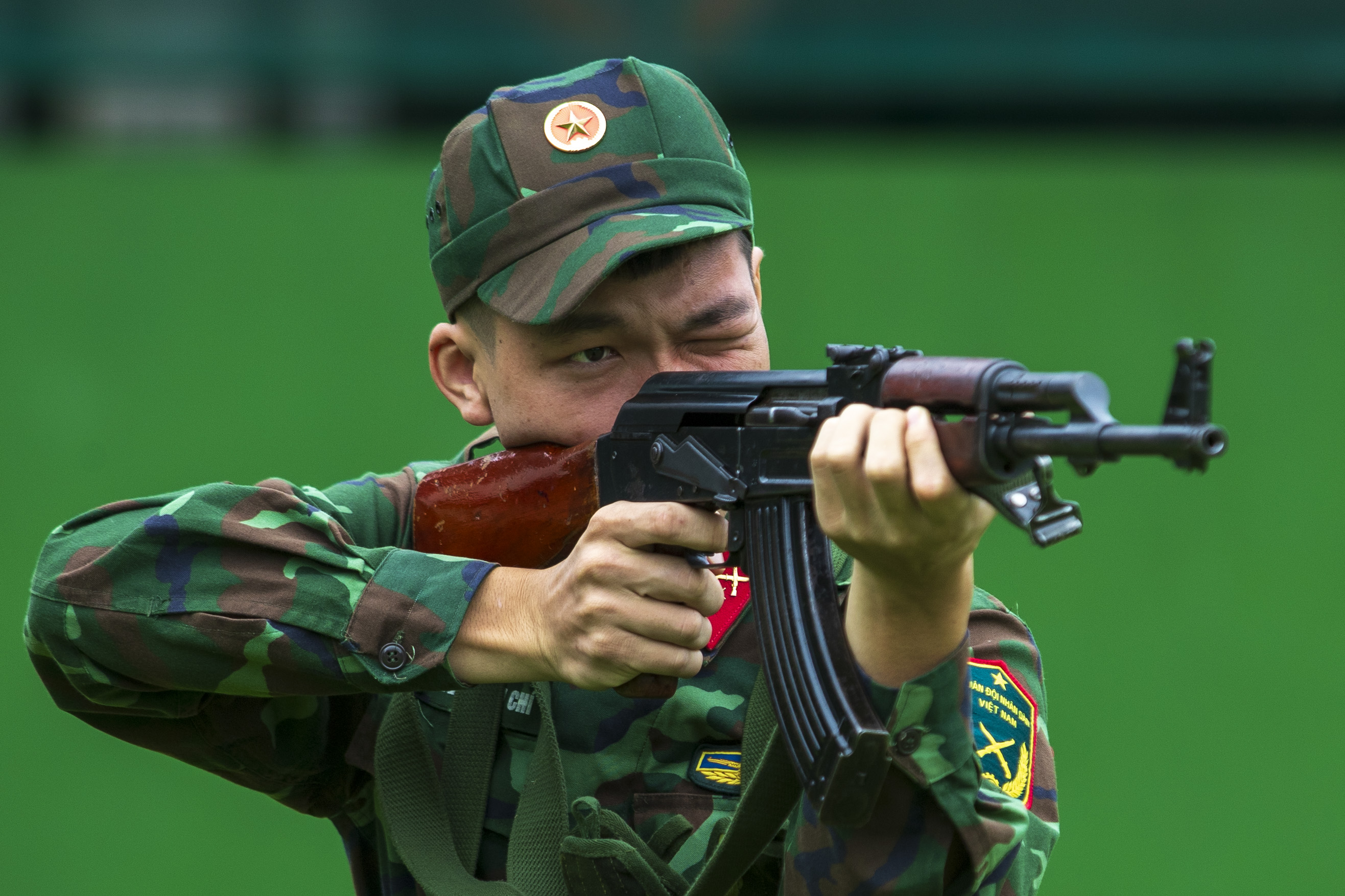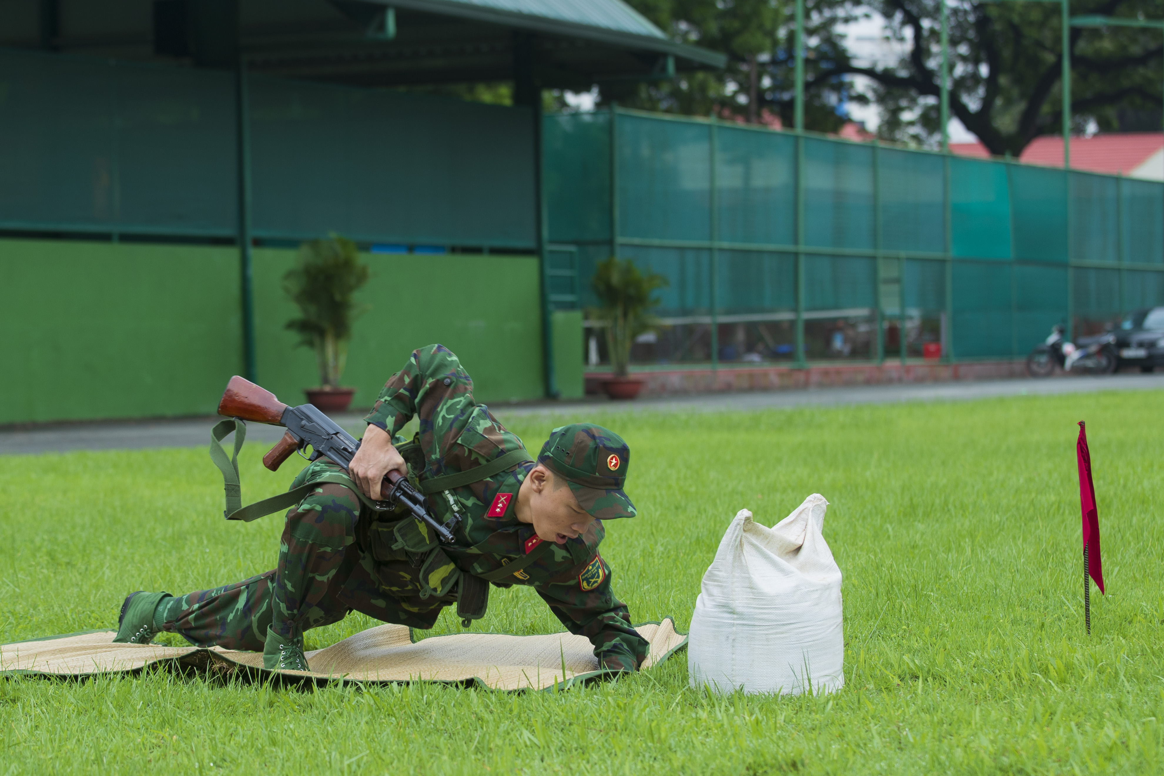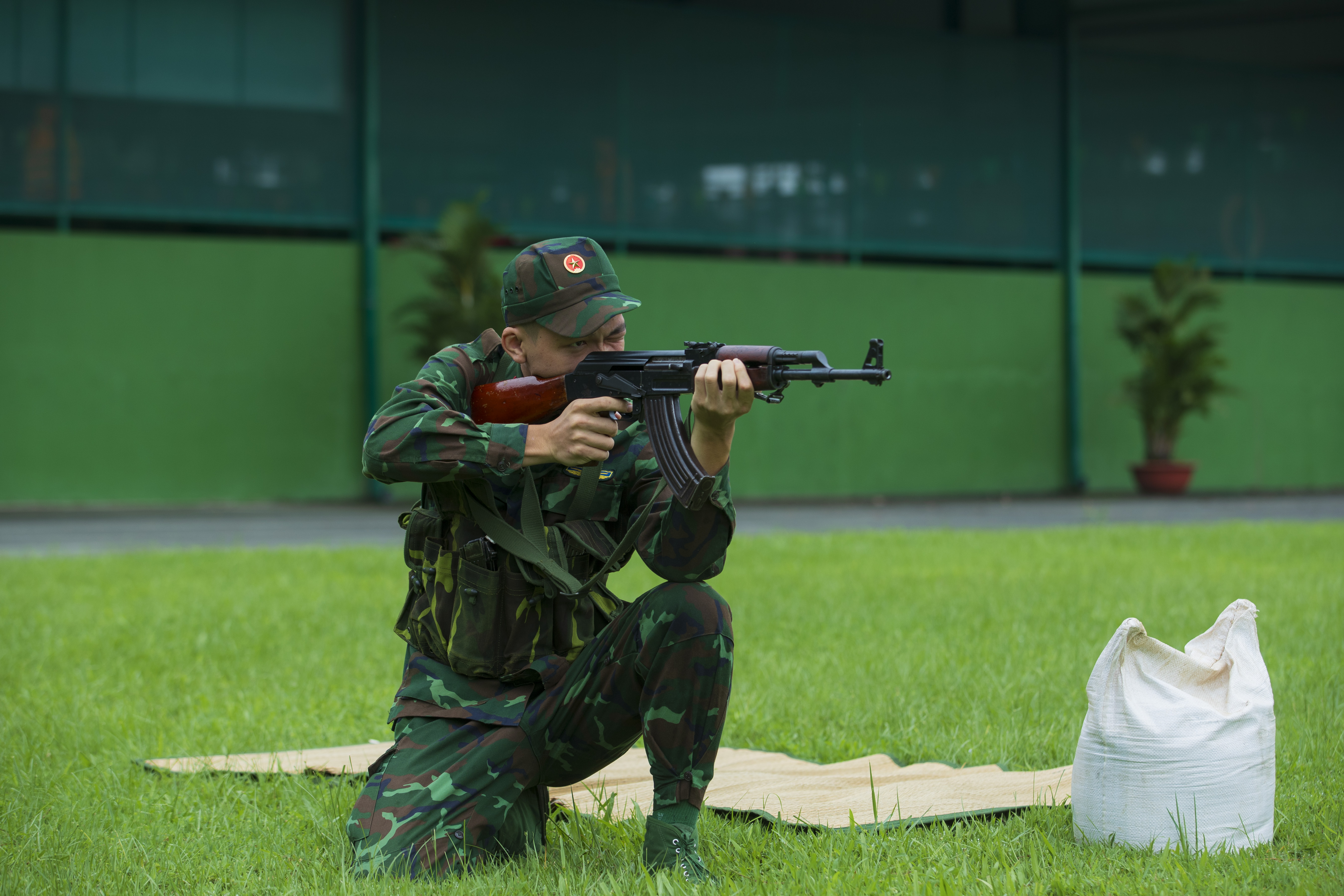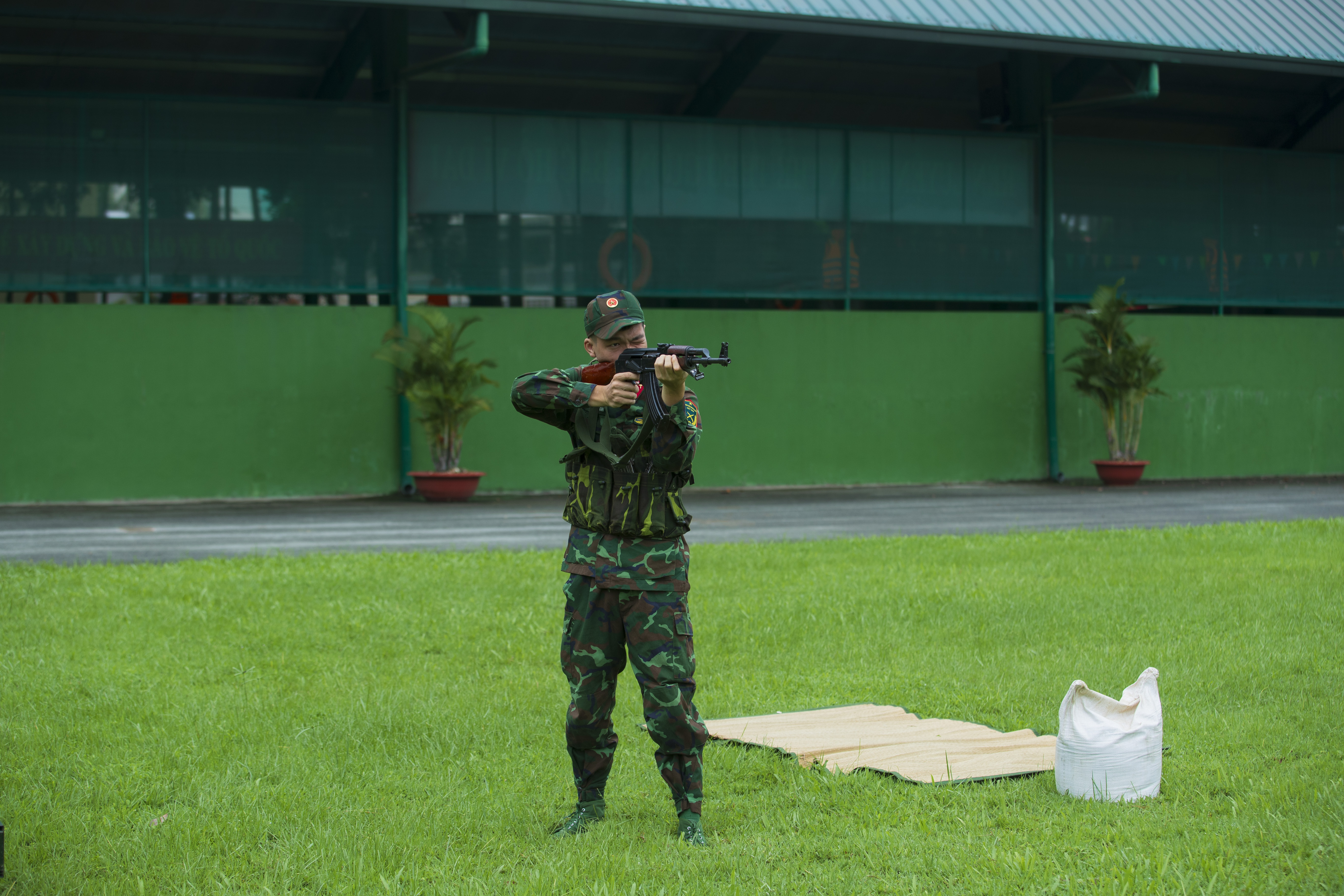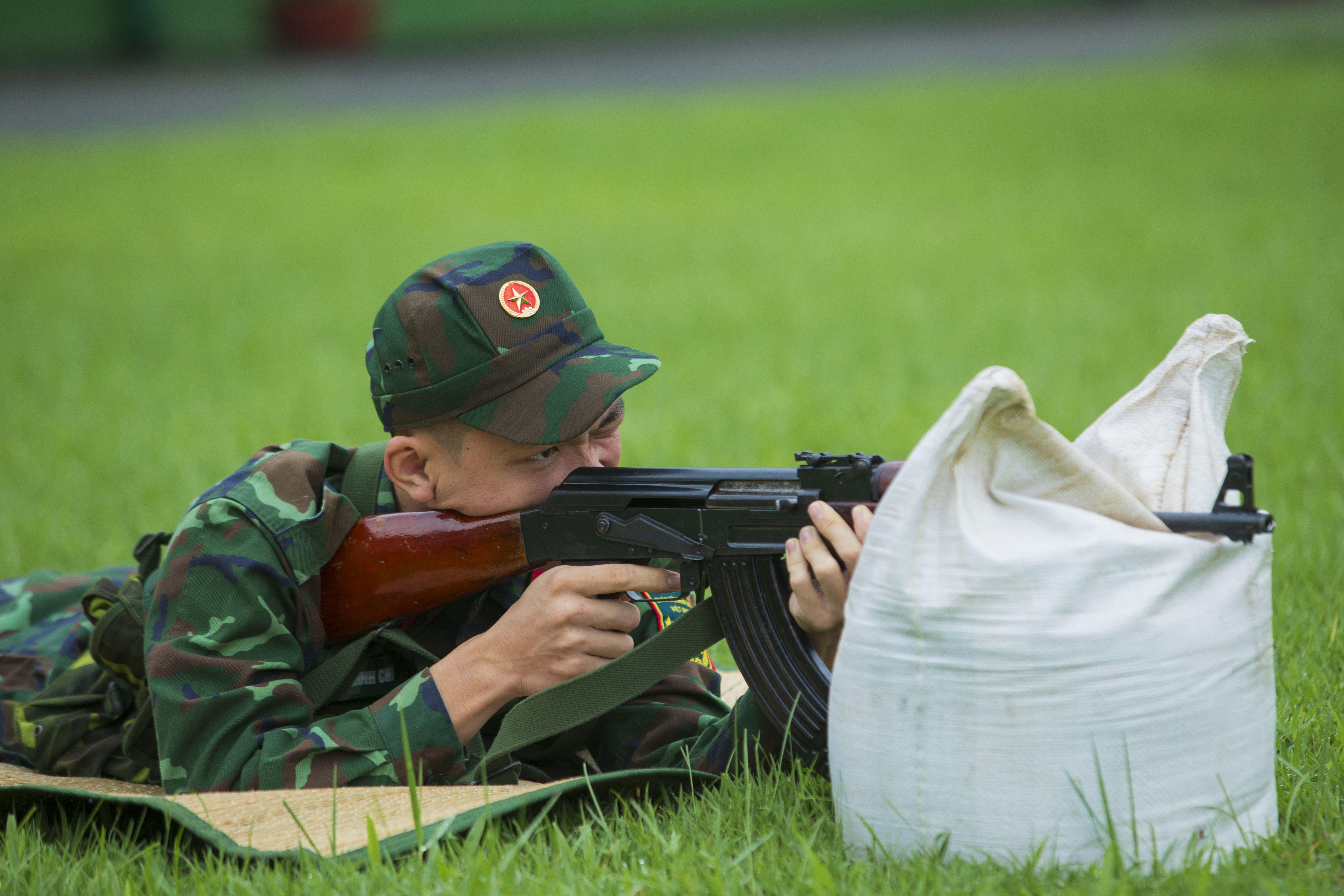 Chiến sĩ làm mẫu, thực hiện 3 tư thế: Nằm bắn, quỳ bắn và đứng bắn súng tiểu liên AK.