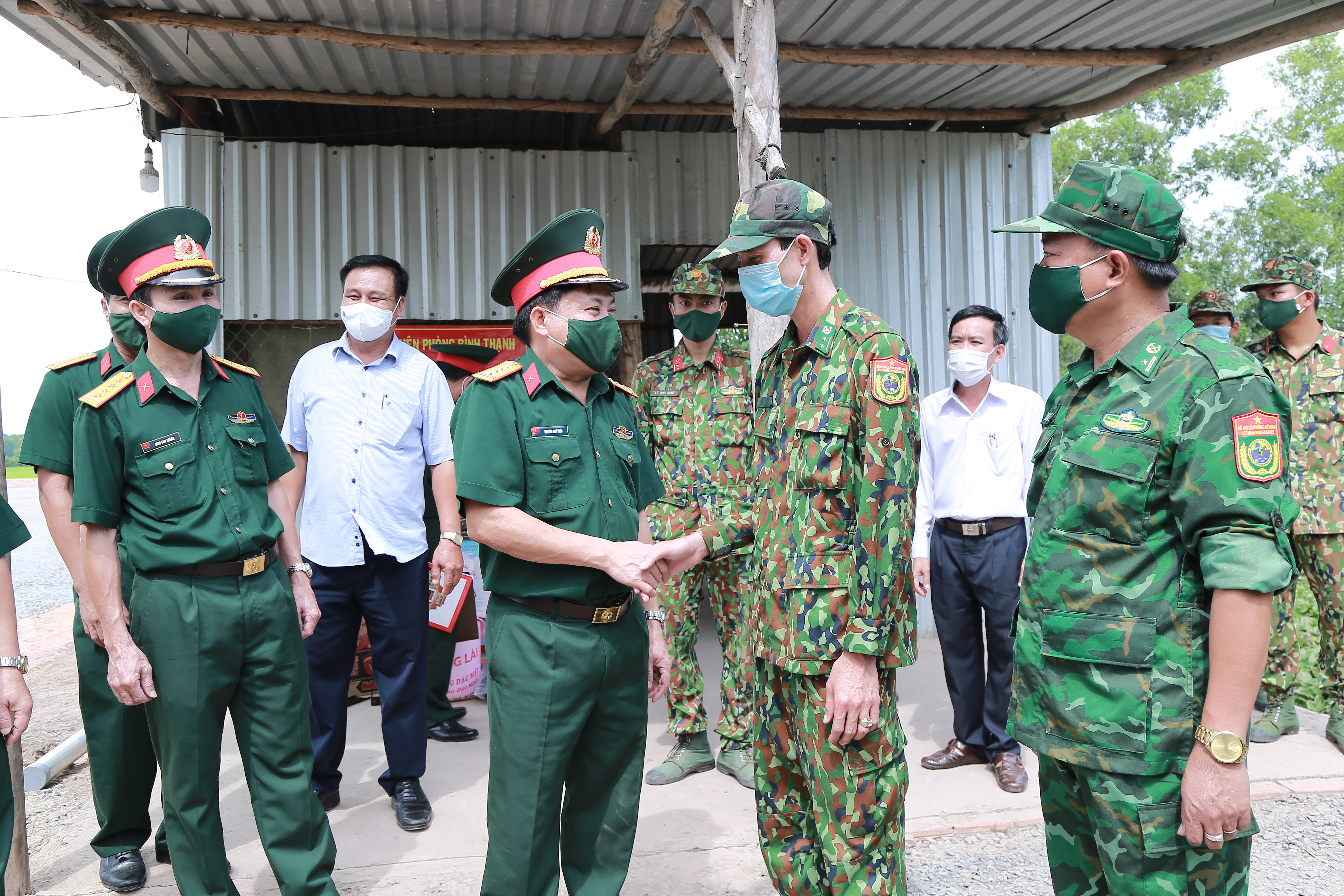 Đồng chí Phó Chủ nhiệm Chính trị Quân khu thăm hỏi, động viên cán bộ, chiến sĩ, lực lượng dân quân tại chốt kiểm dịch Bình Thạnh.