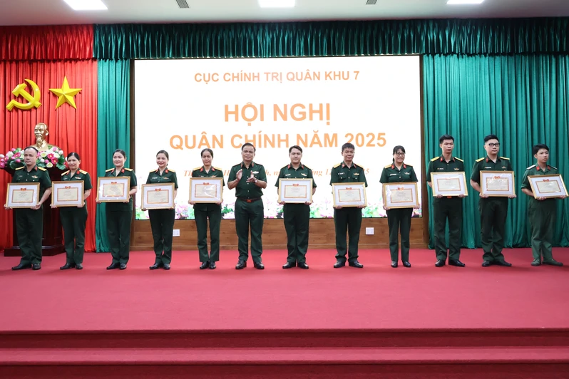 Dịp này, Cục Chính trị Quân khu 7 đã công bố các quyết định khen thưởng cho các tập thể và cá nhân có thành tích xuất sắc trong năm 2025; trao tặng danh hiệu Đơn vị tiên tiến cho 6 tập thể; Đơn vị văn hóa tiêu biểu cho 6 tập thể; Đơn vị 3 nhất cho 12 tập thể; Chiến sĩ thi đua cho 39 cá nhân; Chiến sĩ tiên tiến cho 83 cá nhân; Lao động tiên tiến cho 22 cá nhân và 7 cá nhân có thành tích xuất sắc trong thực hiện nhiệm vụ giúp Nhân dân khắc phục hậu quả thiên tai, bão lũ tại Lâm Đồng.