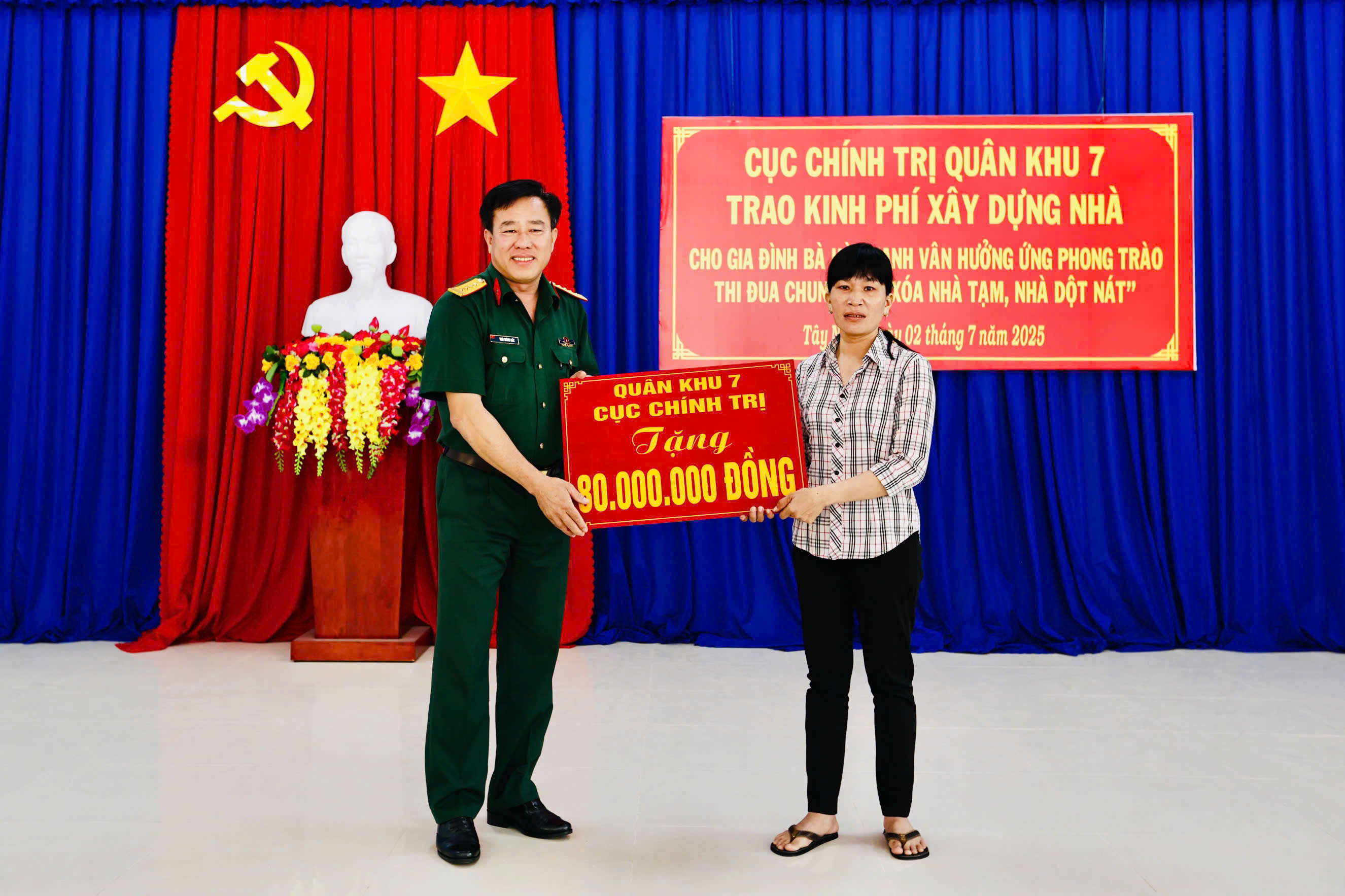 Với tinh thần “tương thân tương ái”, hưởng ứng Phong trào thi đua “Chung tay xóa nhà tạm, nhà dột nát trên phạm vi cả nước năm 2025”, Cục Chính trị Quân khu 7 tiếp tục đẩy mạnh các hoạt động công tác dân vận, chính sách xã hội. Trong đó, chú trọng tổ chức vận động nguồn lực, hỗ trợ kinh phí xây dựng nhà cho các gia đình có hoàn cảnh khó khăn.