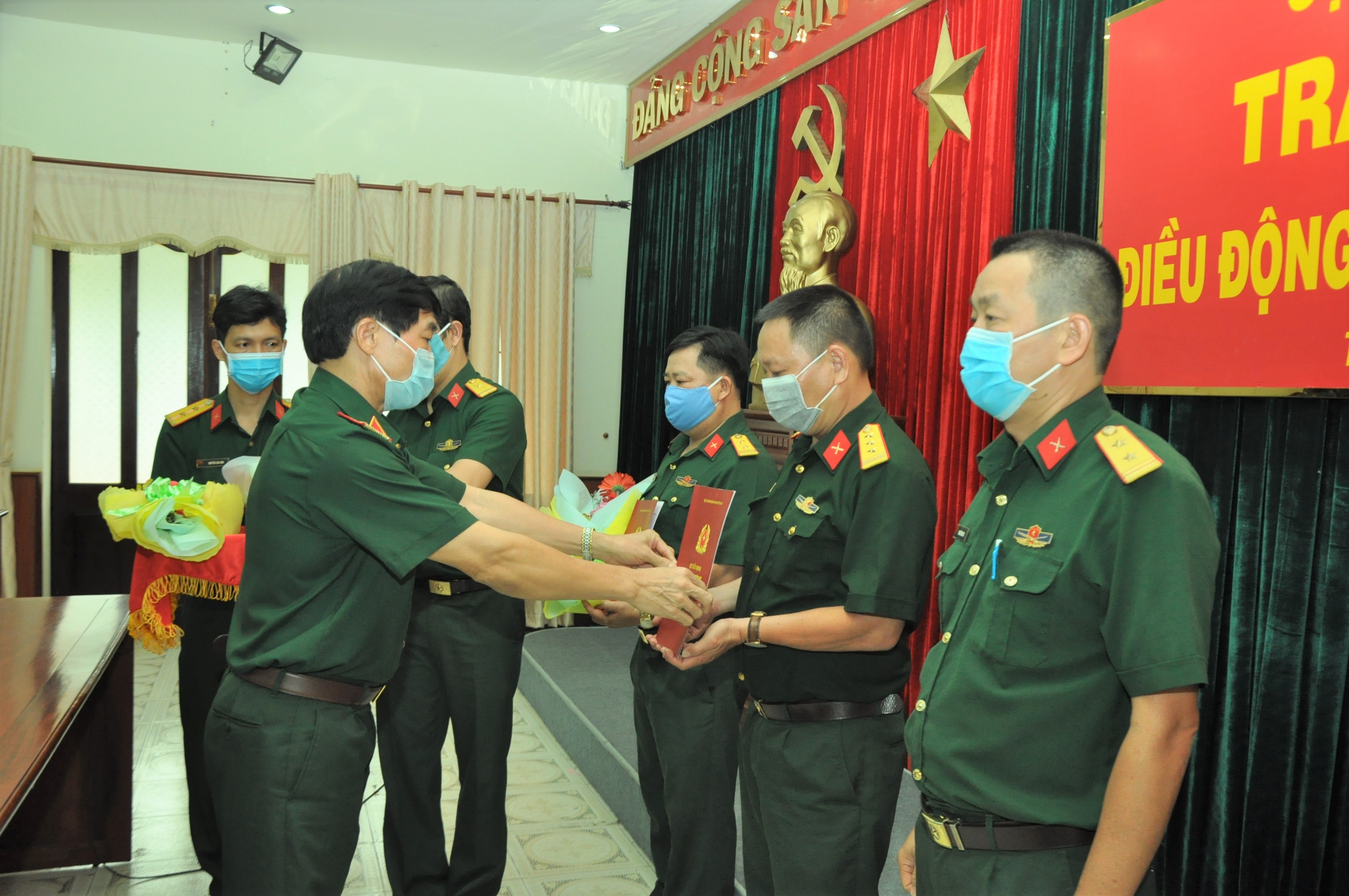 Thiếu tướng Nguyễn Văn Hiệu, Bí thư Đảng ủy Cục Chính trị, Phó Chủ nhiệm Chính trị Quân khu trao quyết định cho các cán bộ.