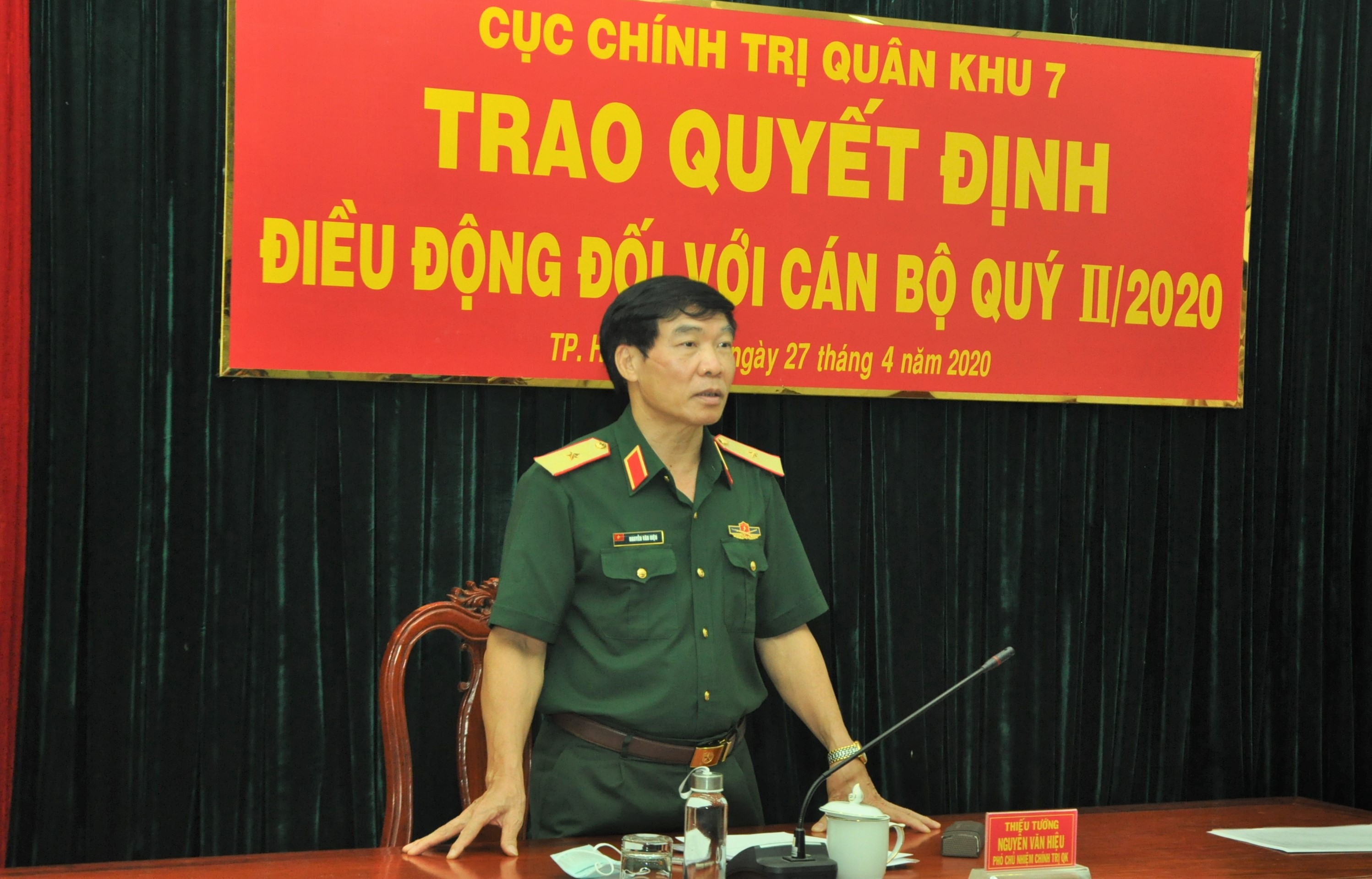 Thiếu tướng Nguyễn Văn Hiệu, Phó Chủ nhiệm Chính trị Quân khu phát biểu tại buổi trao quyết định.
