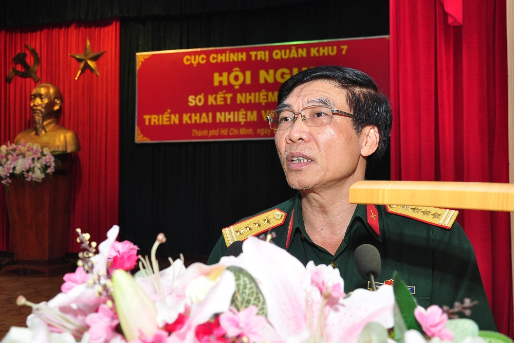 Thiếu tướng Đỗ Văn Bảnh, Phó Bí thư Đảng ủy Cục Chính trị, Chủ nhiệm Chính trị Quân khu 7 phát biểu tại hội nghị