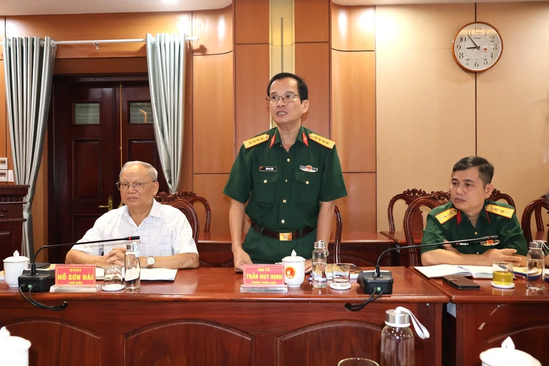 Đại tá Trần Huy Định, Trưởng Phòng Khoa học Quân sự thảo luận, đóng góp ý kiến chỉnh sửa công trình “Tổng kết CTĐ, CTCT trong LLVT Quân khu 7 giai đoạn 2000 – 2025”.