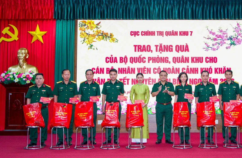 Thiếu tướng Trần Đức Thắng, Bí thư Đảng ủy Cục Chính trị, Phó Chủ nhiệm Chính trị Quân khu trao quà tặng cán bộ, nhân viên có hoàn cảnh khó khăn.