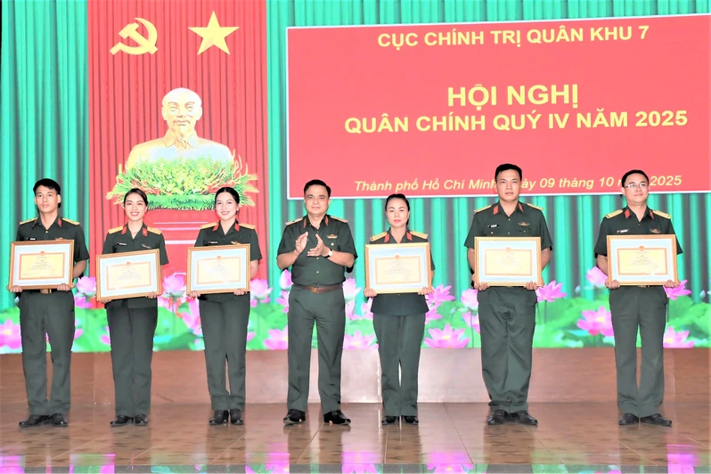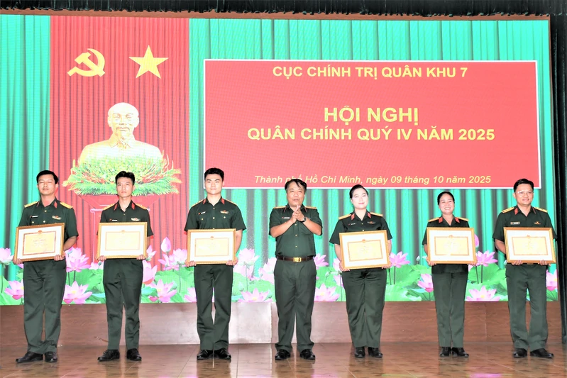 Hội nghị công bố và trao các Quyết định của Bộ Quốc phòng; của Tổng Cục Chính trị Quân đội nhân dân Việt Nam; của Quân khu 7 về việc tặng bằng khen cho các tập thể, cá nhân có thành tích xuất sắc trong tham gia các hoạt động kỷ niệm 80 năm Cách mạng tháng Tám thành công và Quốc khánh nước Cộng hòa xã hội chủ nghĩa Việt Nam; Quyết định của Cục Chính trị Quân khu về việc công nhận đạt tiêu chuẩn “Đơn vị 3 nhất” quý III năm 2025 đối với các tập thể trực thuộc Cục Chính trị Quân khu.