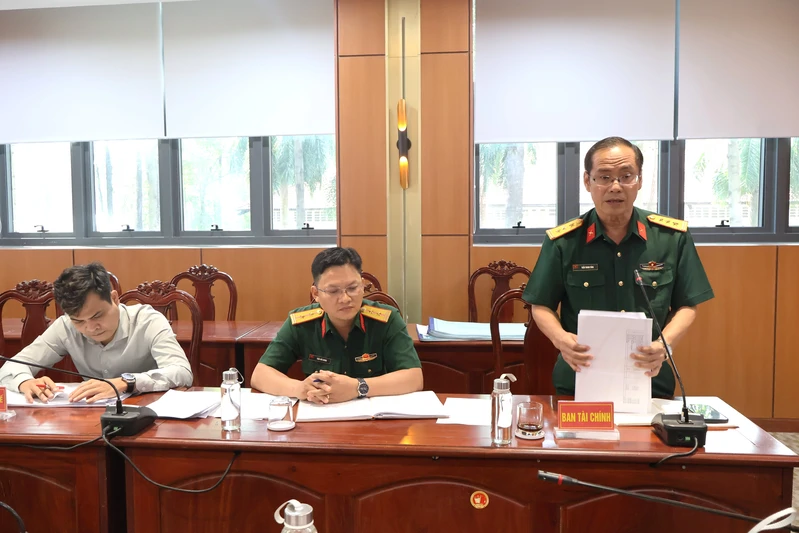Thượng tá Trần Thanh Tùng, Trưởng Ban Tài chính Cục Chính trị Quân khu báo cáo tiến độ thực hiện dự án xây dựng trụ sở Viện kiểm sát quân sự Quân khu.