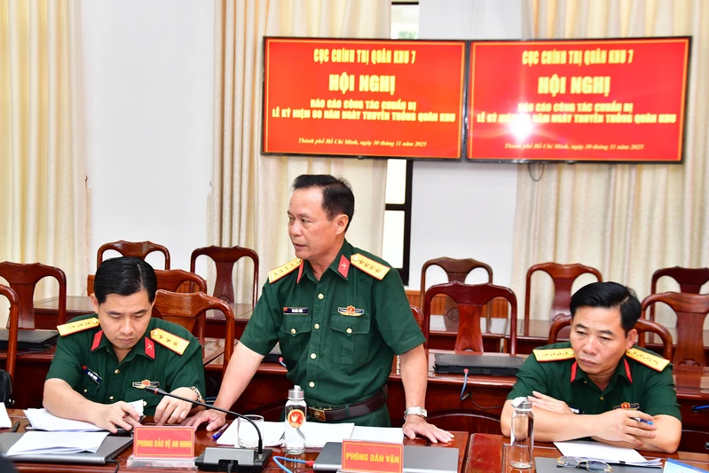 Tại hội nghị, Thiếu tướng Phạm Anh Tuấn, Chủ nhiệm Chính trị Quân khu đã nghe đại diện các cơ quan, đơn vị trực thuộc Cục Chính trị báo cáo tiến độ công tác chuẩn bị Lễ kỷ niệm 80 năm Ngày truyền thống LLVT Quân khu 7 như: Hoạt động về nguồn, viếng nghĩa trang liệt sĩ; công tác phát hành thư mời, quà tặng, đón tiếp đại biểu; chương trình nghệ thuật; phim truyền thống; trưng bày triển lãm; công tác bảo đảm an ninh, an toàn tại buổi lễ; công tác phối hợp thông tin tuyên truyền về Lễ kỷ niệm…