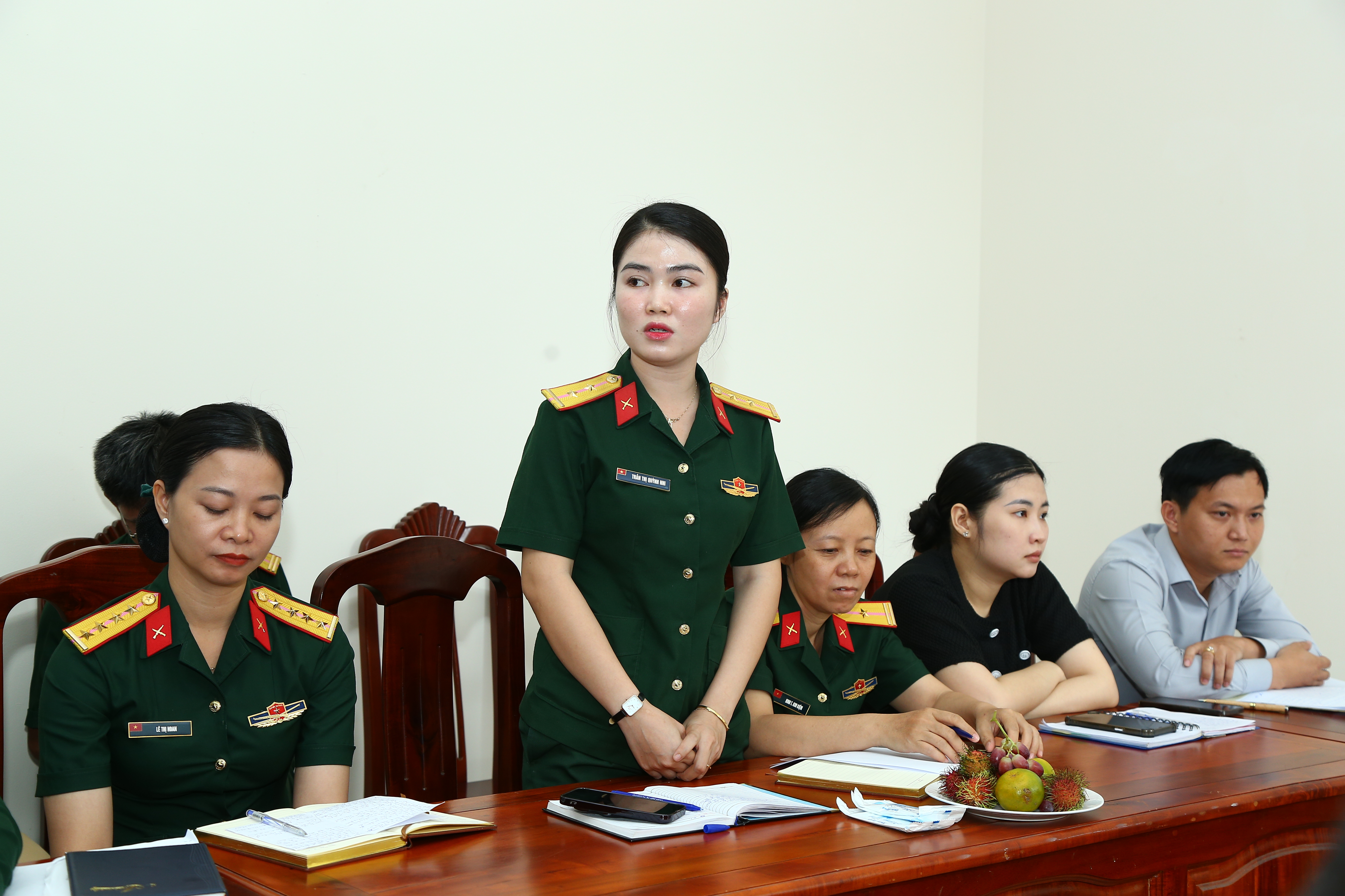 Trung úy QNCN Trần Thị Quỳnh Nhi mong muốn thủ trưởng Cục Chính trị quan tâm nhiều hơn nữa đến đời sống cán bộ, phóng viên Báo Quân khu, nhất là các chị em, phụ nữ.