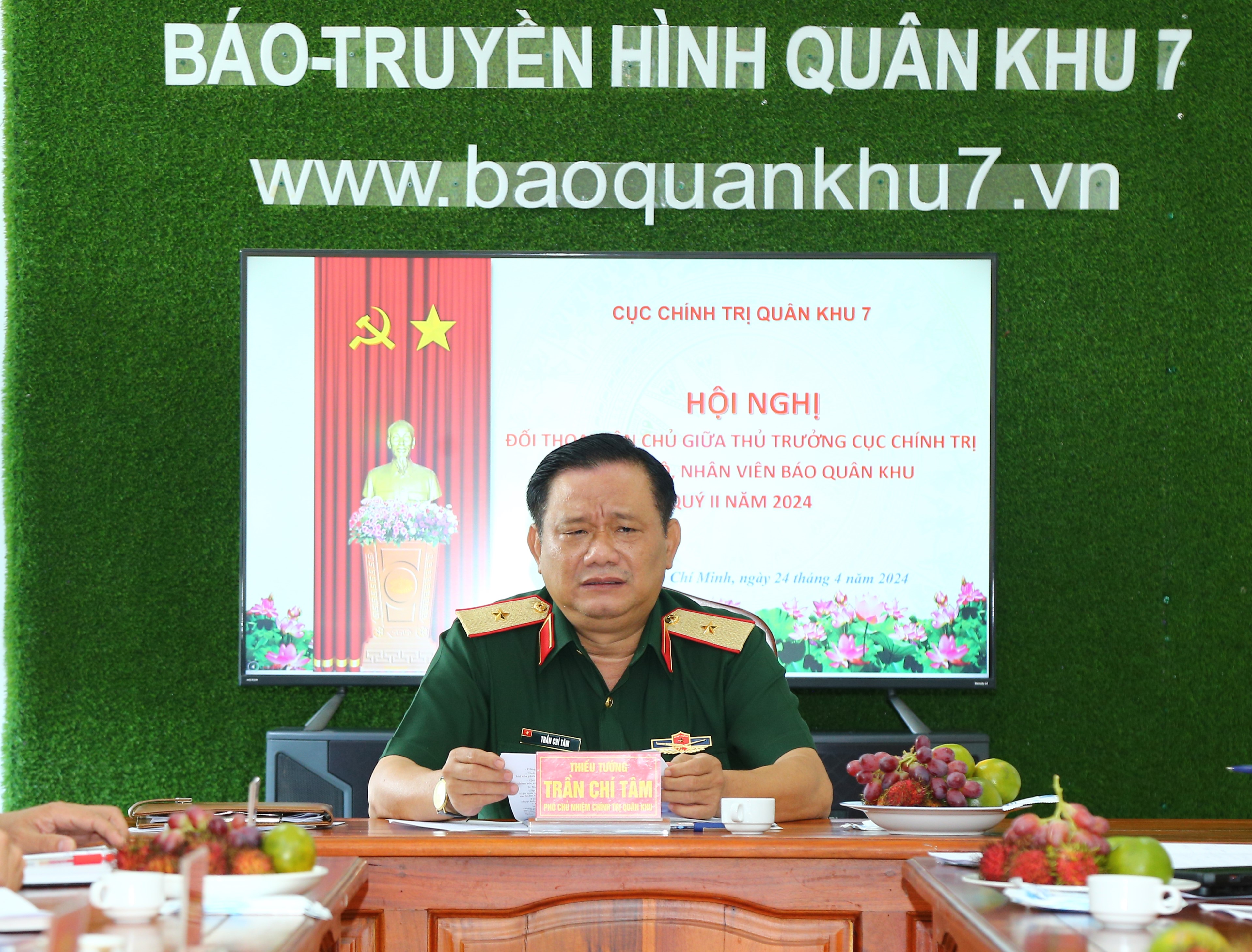 Sau khi lắng nghe những tâm tư, nguyện vọng, đề xuất của cán bộ, biên tập viên, phóng viên Báo Quân khu, Thiếu tướng Trần Chí Tâm, Bí thư Đảng ủy Cục Chính trị, Phó Chủ nhiệm Chính trị Quân khu giải đáp trực tiếp những ý kiến theo thẩm quyền nhằm bảo đảm quyền lợi cho cán bộ, phóng viên Báo Quân khu.