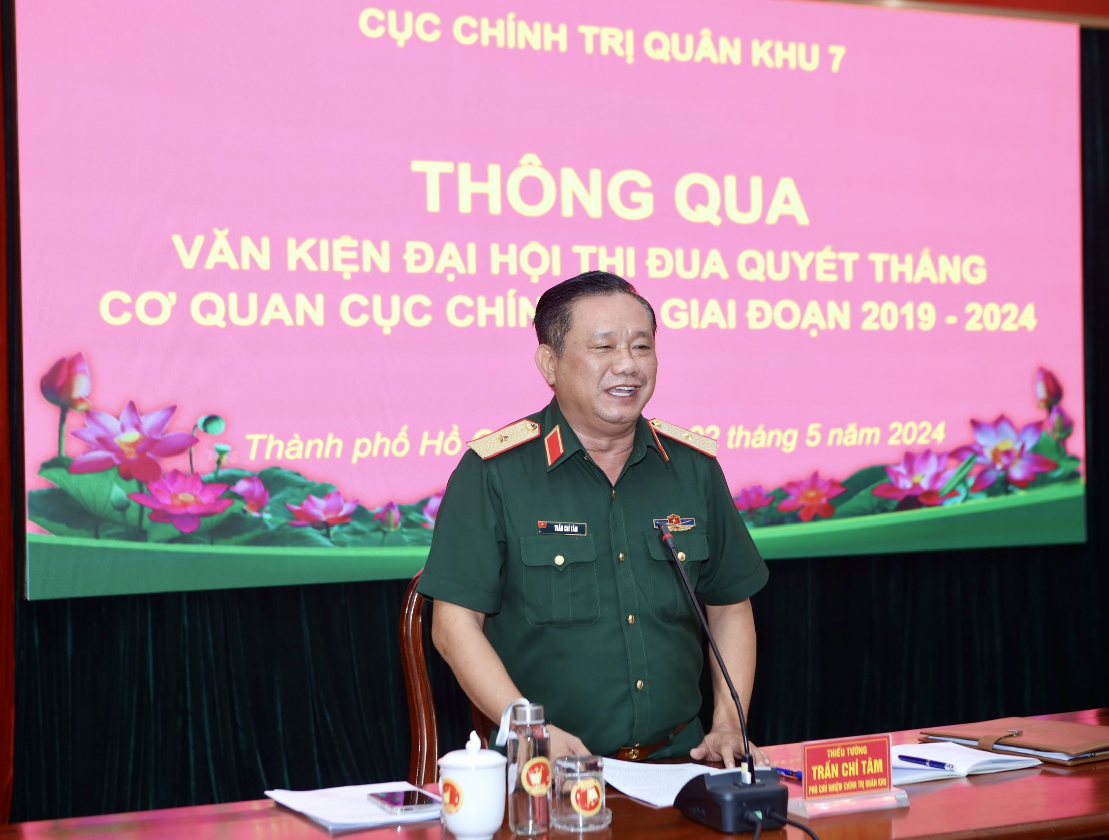 Thiếu tướng Trần Chí Tâm, Bí thư Đảng ủy Cục Chính trị, Phó Chủ nhiệm Chính trị Quân khu chủ trì hội nghị.
