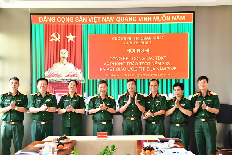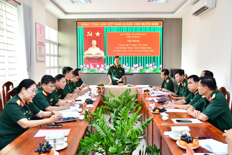 (QK7 – Online) - Sáng ngày 20/1, Cụm thi đua 2 Cục Chính trị Quân khu 7 tổ chức hội nghị tổng kết công tác thi đua, khen thưởng và Phong trào Thi đua Quyết thắng năm 2025, ký kết giao ước thi đua năm 2026. Đại tá Nguyễn Văn Lộc, Phó Chủ nhiệm Chính trị Quân khu dự và phát biểu chỉ đạo. Dự hội nghị có thủ trưởng các cơ quan, đơn vị thuộc Cụm thi đua 2.
