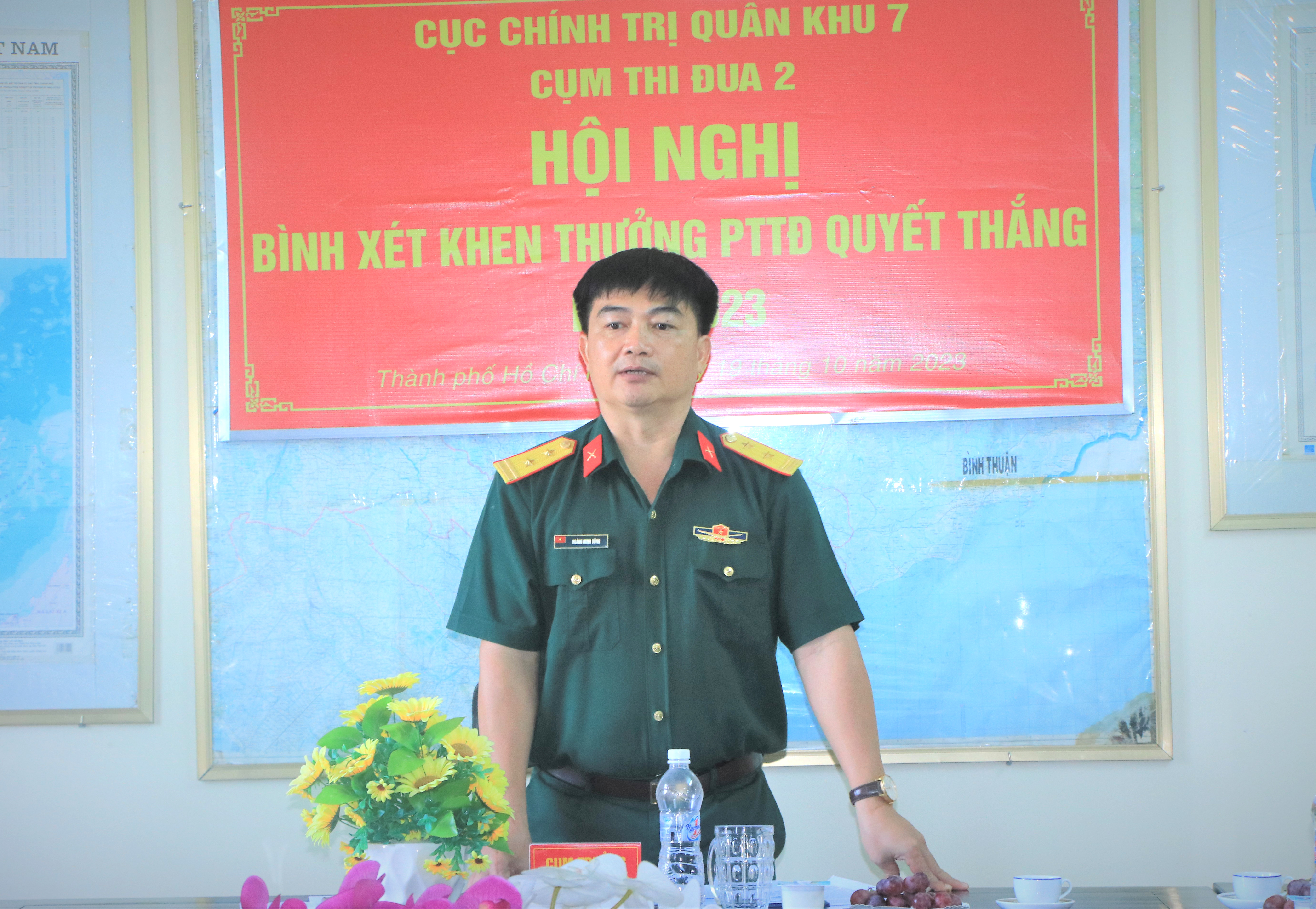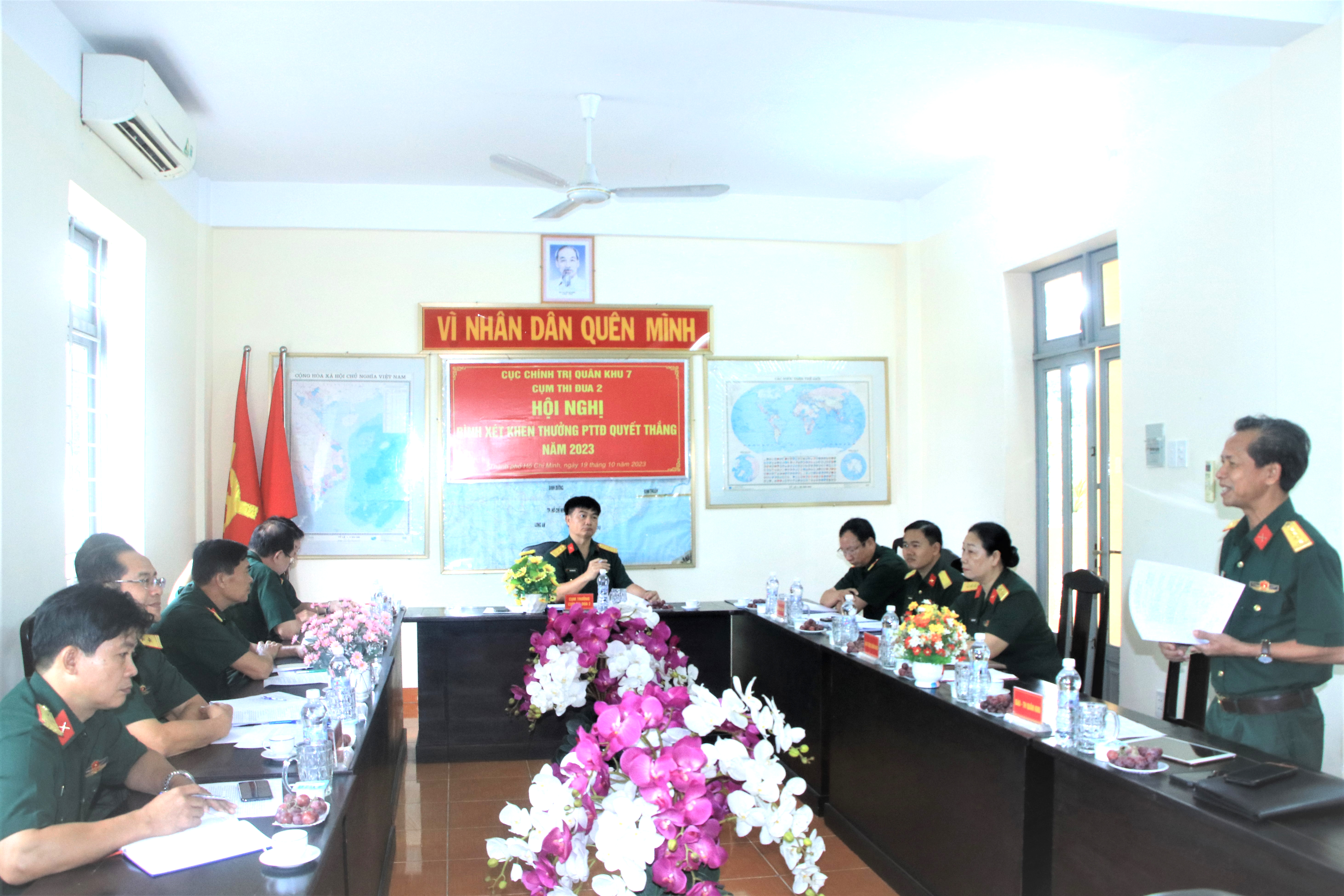 (QK7 Online) - Ngày 19-10, Cụm thi đua 2, Cục Chính trị Quân khu gồm đơn vị: Đoàn Văn công Quân khu, Đoàn An điều dưỡng 28, Bảo tàng Quân khu, Báo Quân khu, Đội K70, Xưởng in và Ban Tài chính tổ chức hội nghị bình xét khen thưởng Phong trào Thi đua Quyết thắng năm 2023.