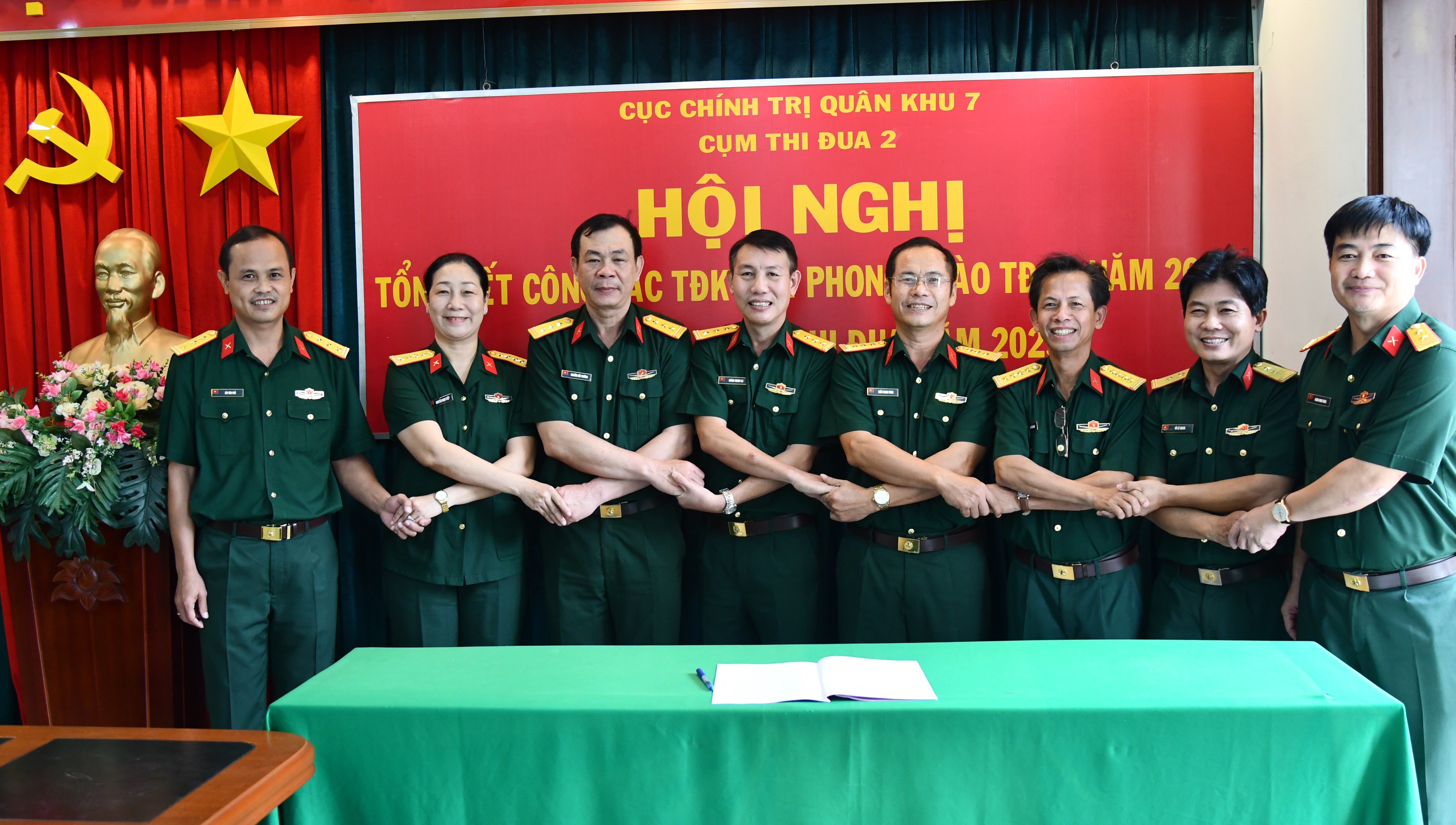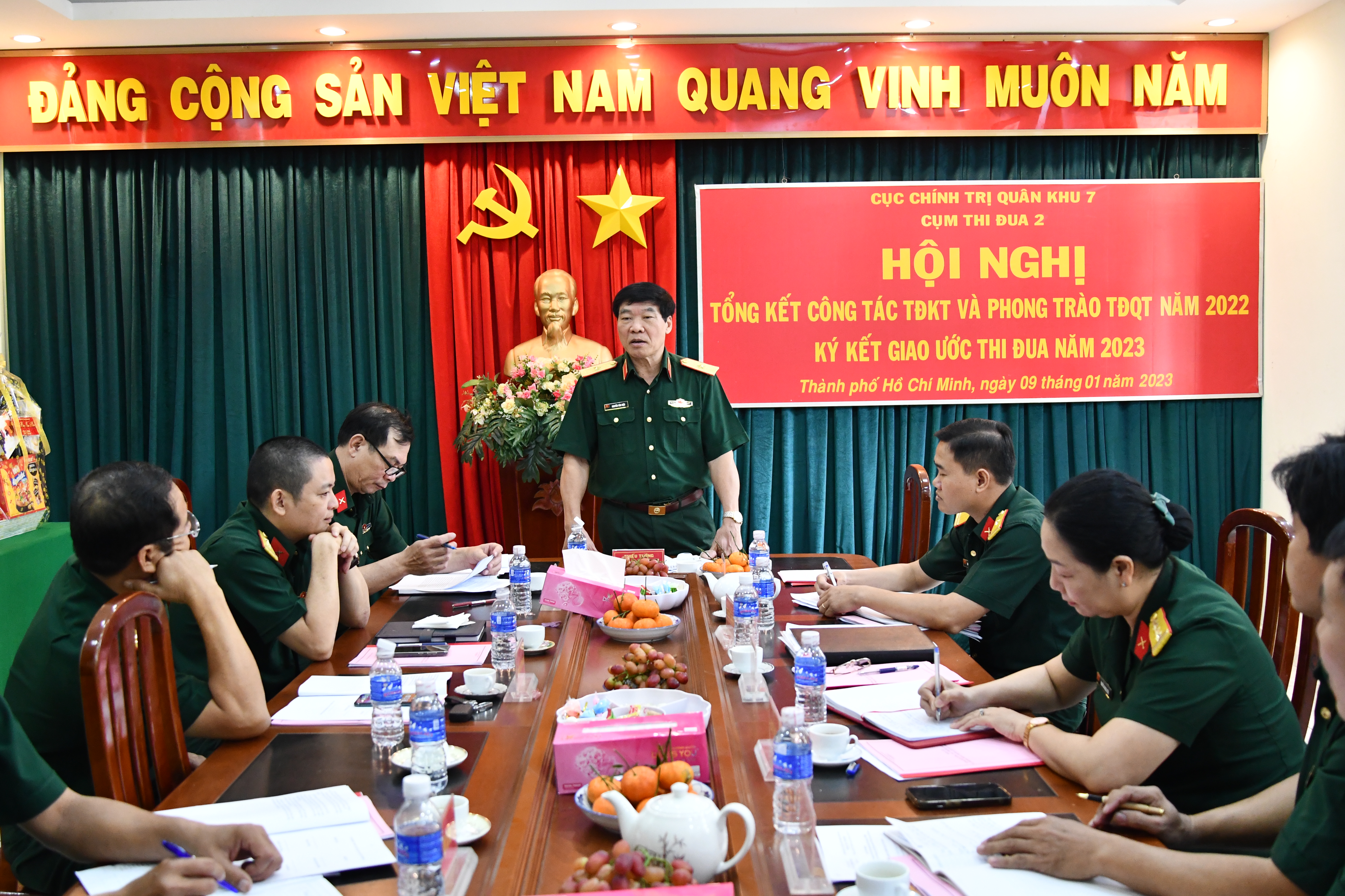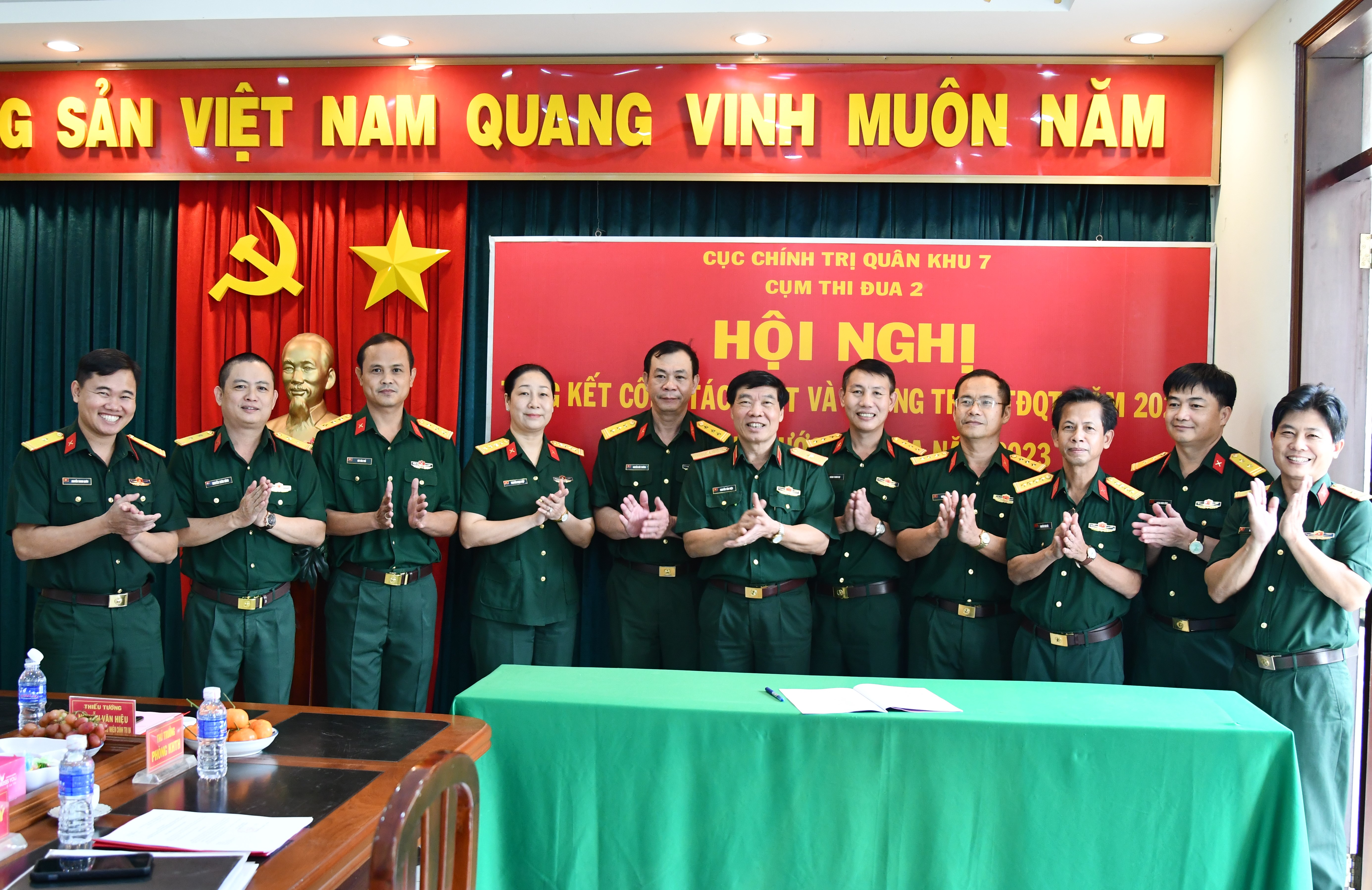 (QK7 Online) - Ngày 09/01, Cụm thi đua 2, Cục Chính trị Quân khu 7 tổ chức tổng kết công tác thi đua khen thưởng (TĐKT) và phong trào thi đua quyết thắng (TĐQT) năm 2022; ký kết giao ước thi đua năm 2023. Thiếu tướng Nguyễn Văn Hiệu, Bí thư Đảng ủy Cục Chính trị, Phó Chủ nhiệm Chính trị Quân khu đến dự.