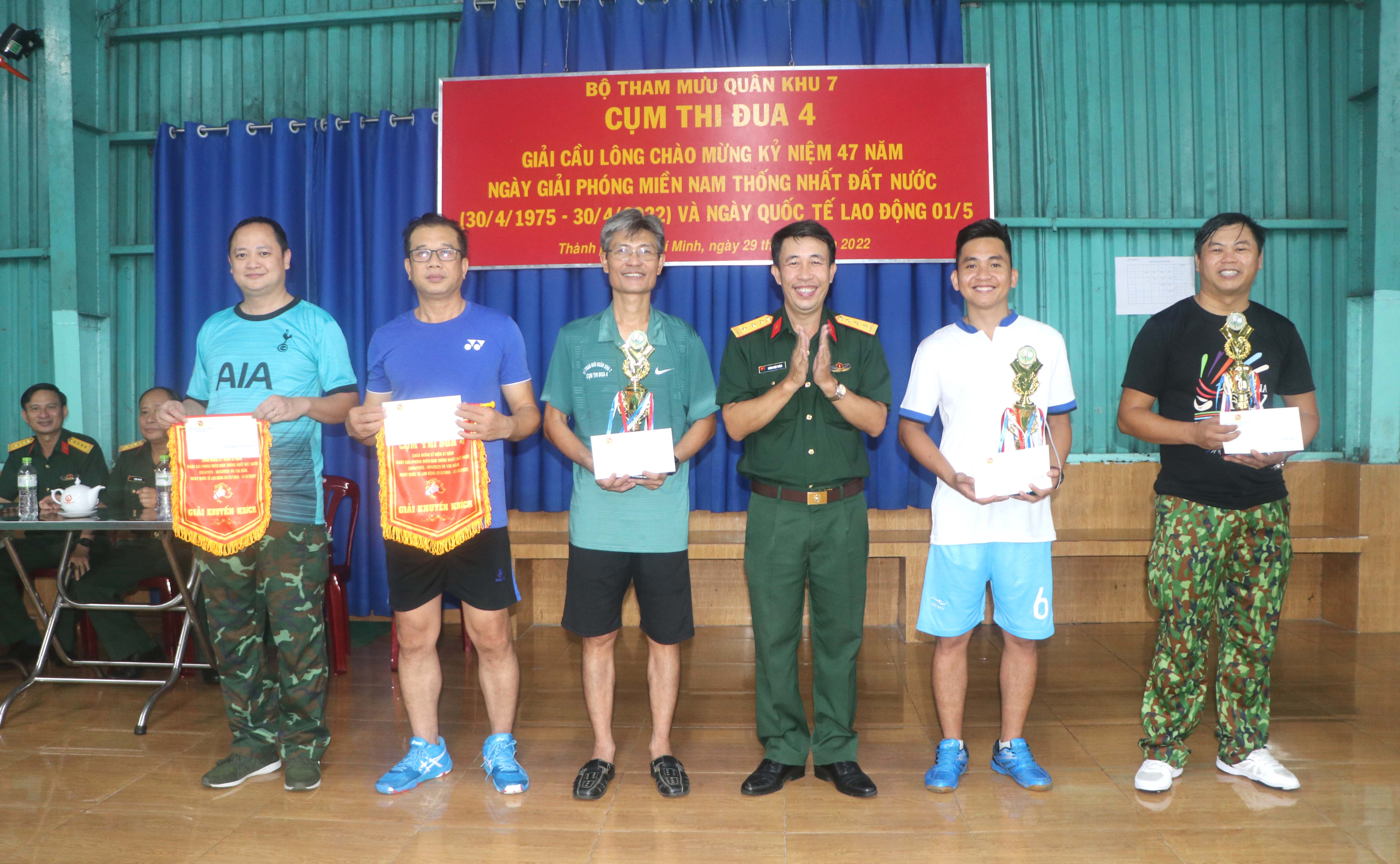 Thượng tá Lương Nhật Thăng, Phó Chánh Văn phòng Quân khu, đơn vị Cụm trưởng Cụm thi đua 4 trao thưởng các đội thi đấu.