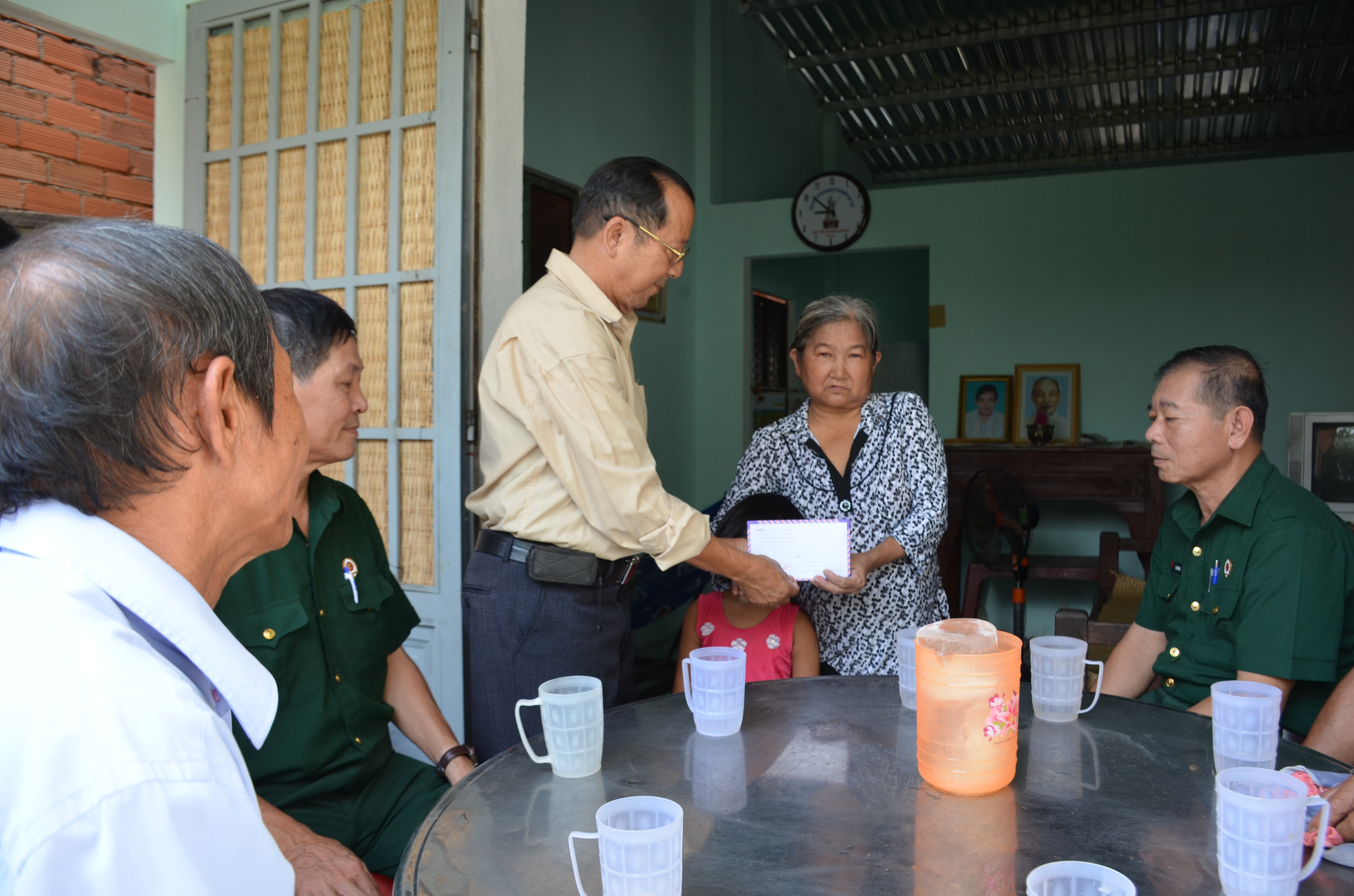 Cựu chiến binh Lưu Văn Lùm tặng quà cho bà Hứa Thị Mững trong ngày nhận nhà mới