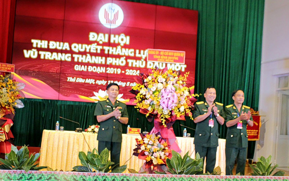 (QK7 Online) - Ngày 12-5, Ban CHQS thành phố Thủ Dầu Một, tỉnh Bình Dương tổ chức Đại hội Thi đua Quyết thắng (TĐQT) giai đoạn 2019 - 2024. Dự đại hội có Đại tá Nguyễn Hoàng Minh, Chỉ huy trưởng Bộ Chỉ huy Quân sự (CHQS) tỉnh; đồng chí Nguyễn Văn Đông, Bí thư Thành ủy Thủ Dầu Một.