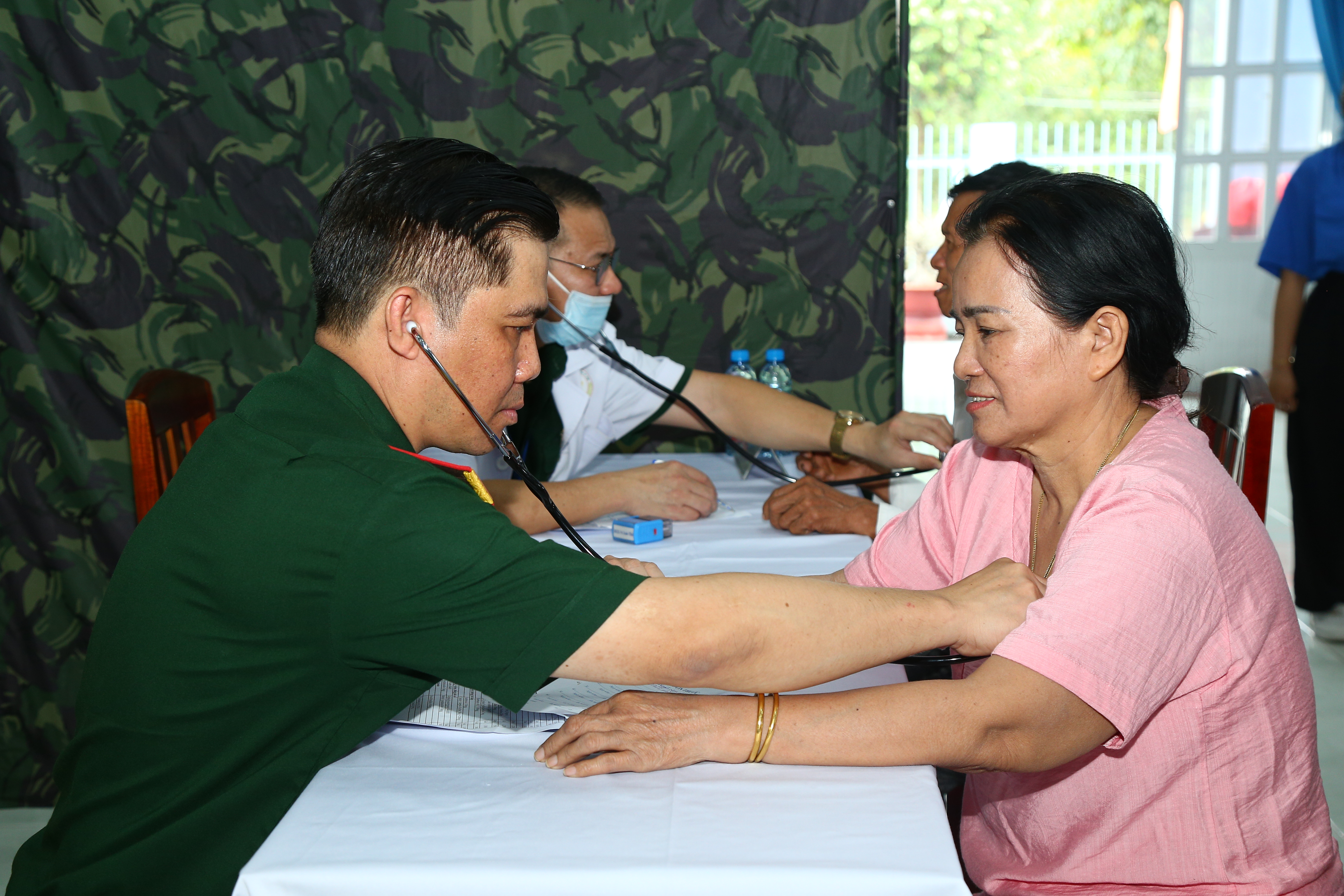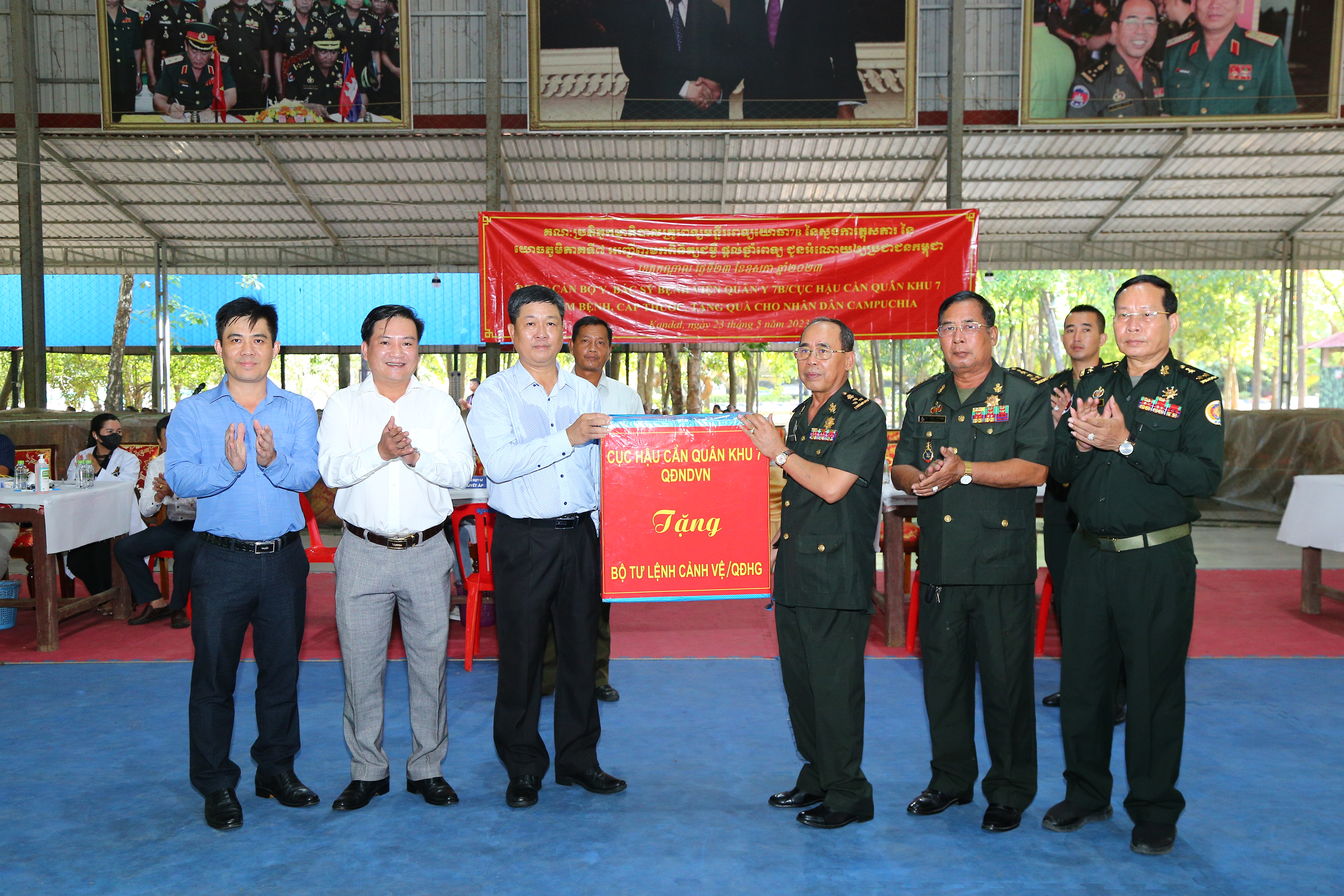 Đại tá, BSCK II, Thầy thuốc ưu tú Phạm Hồng Hà (ngoài cùng bên trái) và đoàn công tác Cục Hậu cần - Kỹ thuật Quân khu sang khám bệnh, tặng quà cho quân, dân nước bạn Campuchia.