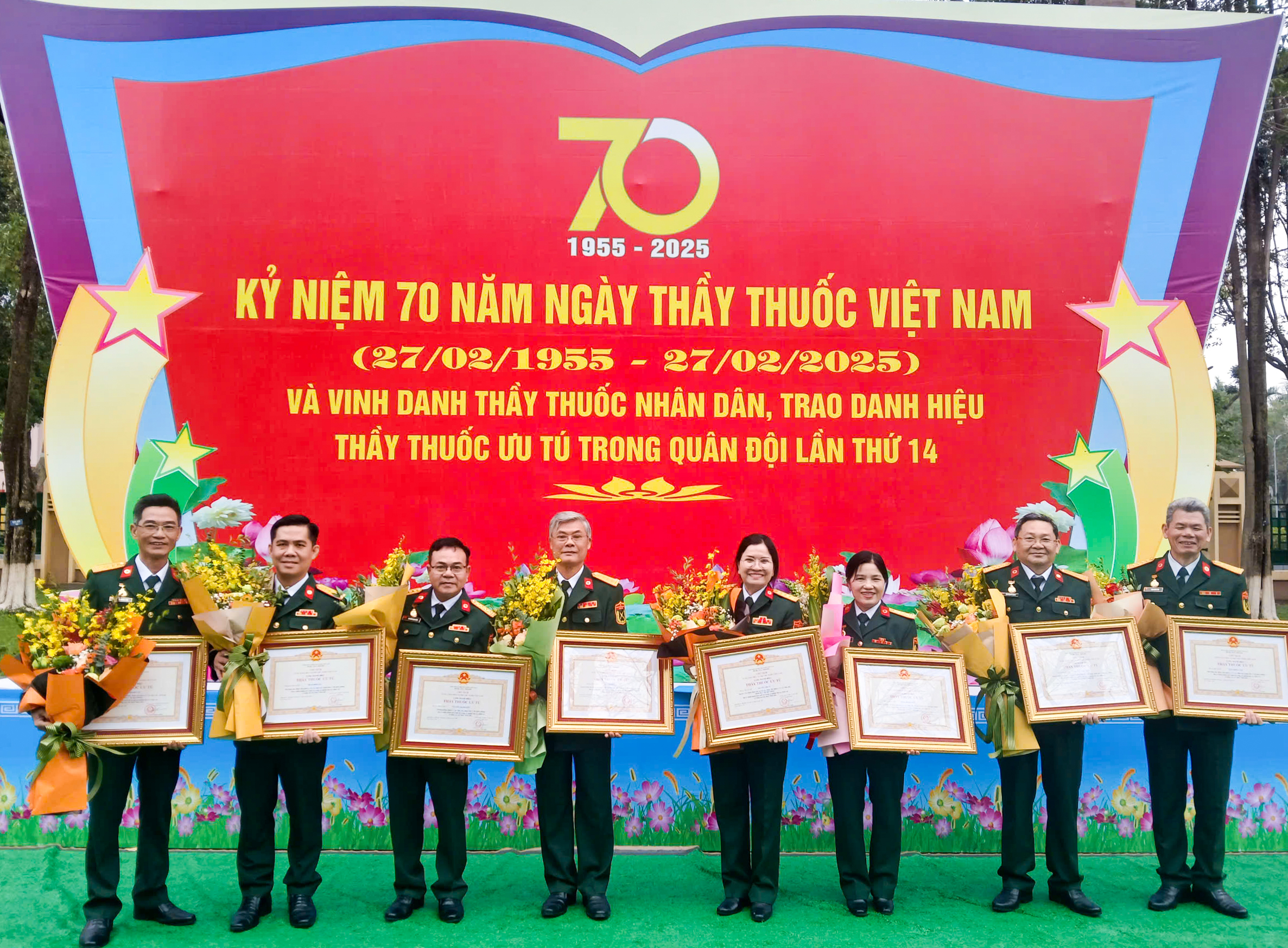 Đại tá, BSCK II Phạm Hồng Hà (thứ hai từ trái qua) và bác sĩ các bệnh viện của Quân khu nhận danh hiệu Thầy thuốc ưu tú nhân kỷ niệm 70 năm Ngày Thầy thuốc Việt Nam (27/2/1955 - 27/2/2025).