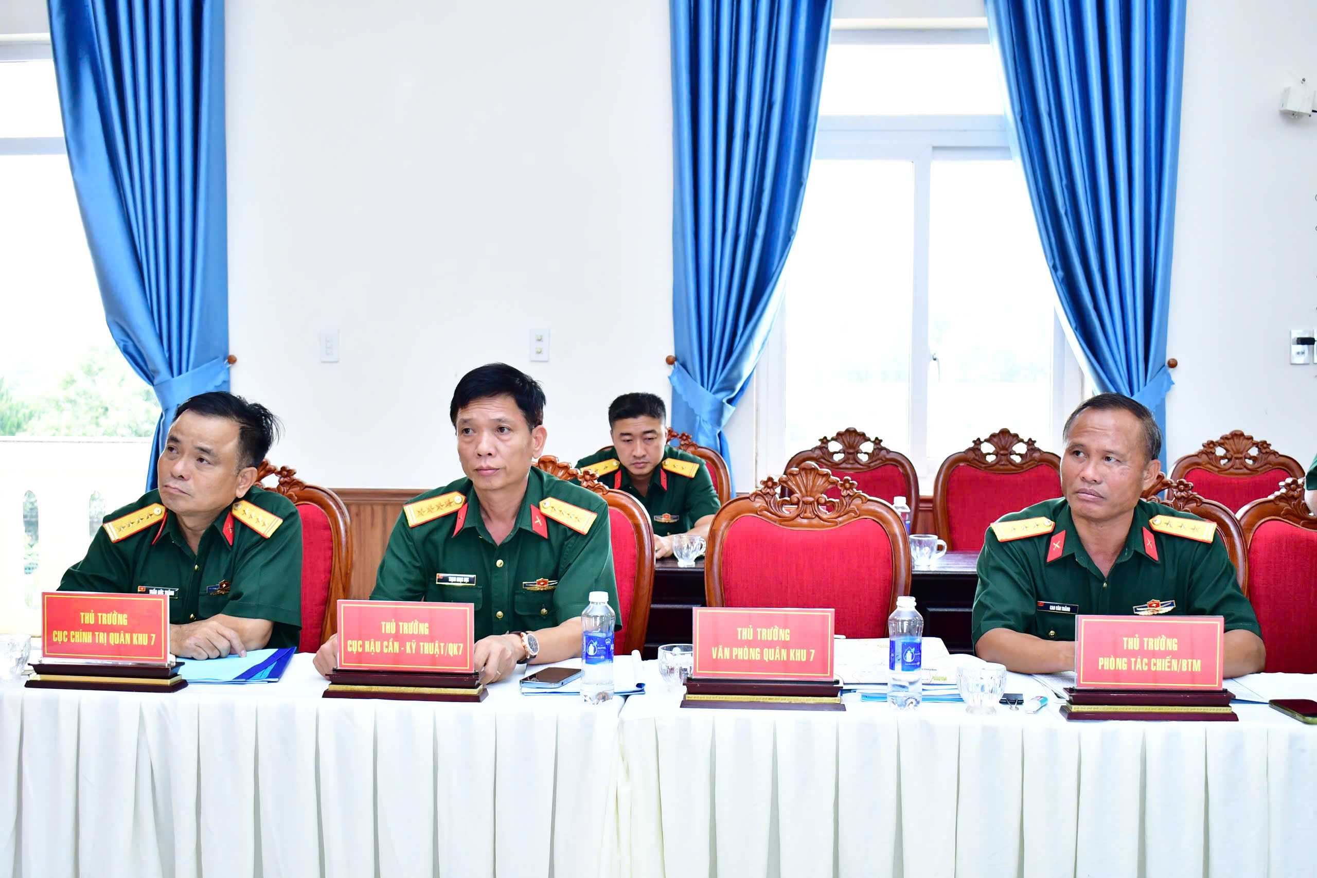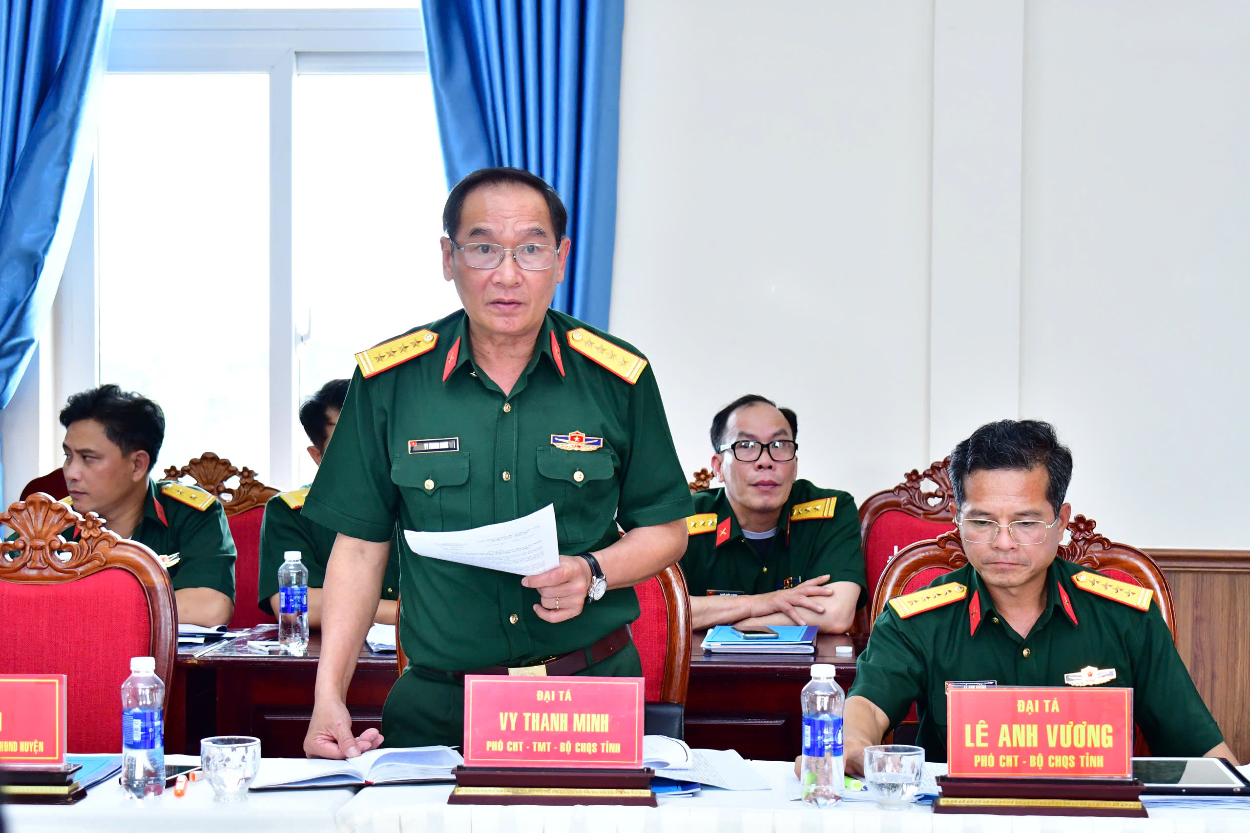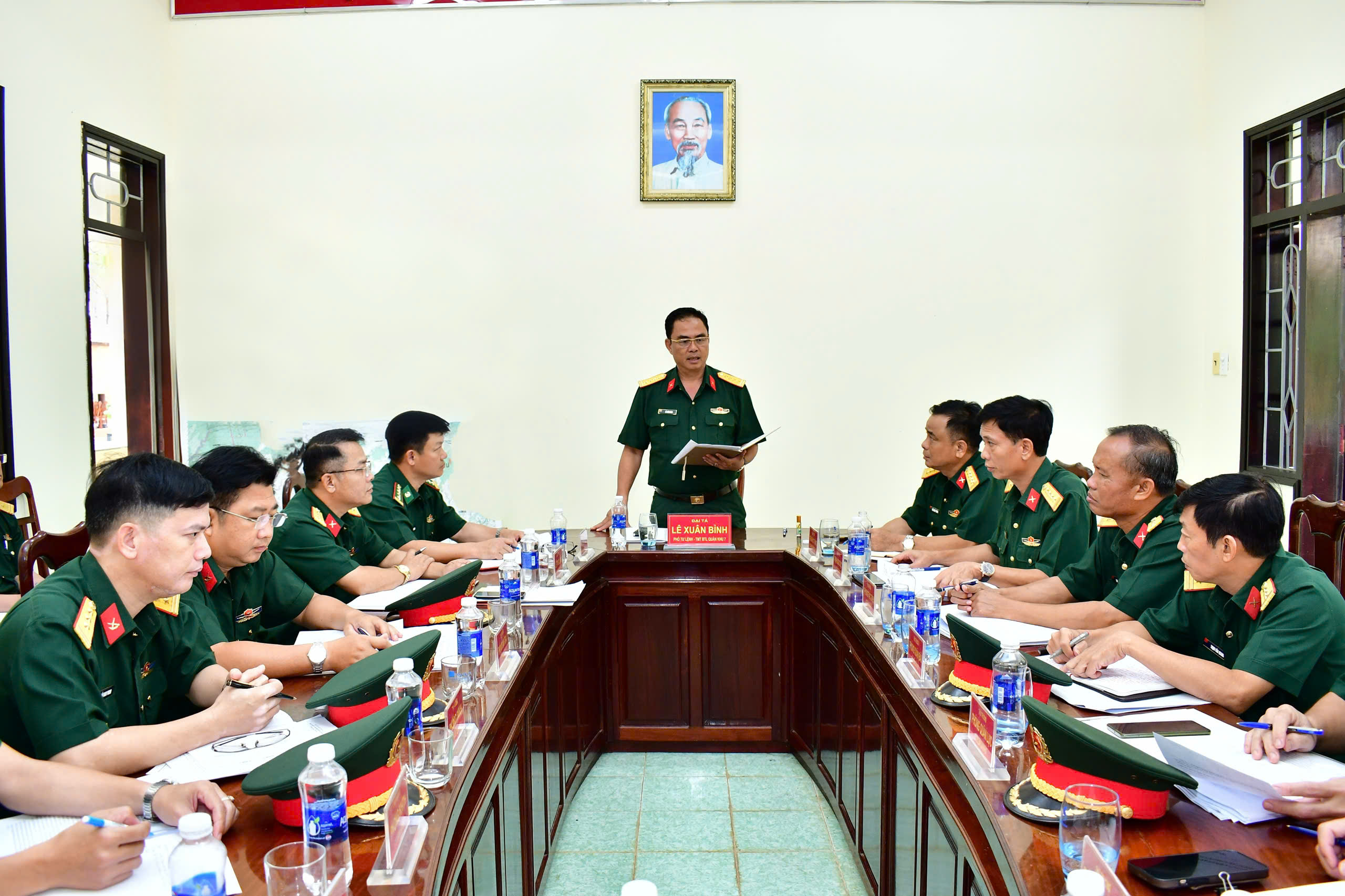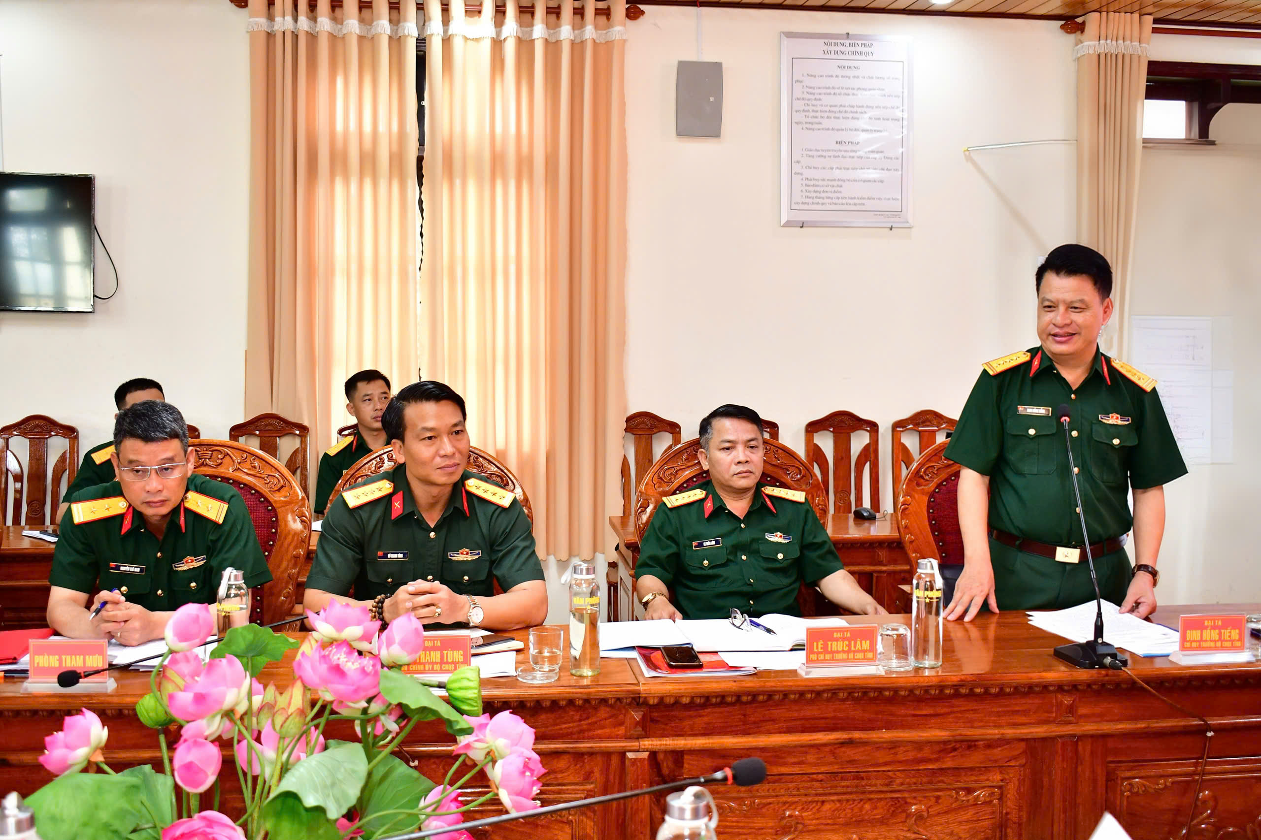 Đại tá Vy Thanh Minh, Phó Chỉ huy trưởng, Tham mưu trưởng Bộ CHQS tỉnh Lâm Đồng báo cáo phương án bố trí Ban chỉ huy phòng thủ khu vực trên địa bàn tỉnh. Thủ trưởng các cơ quan Quân khu dự buổi làm việc.