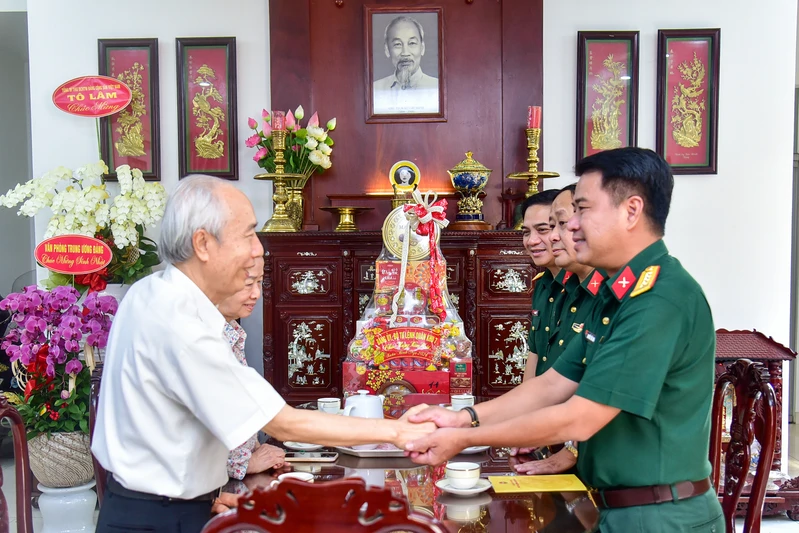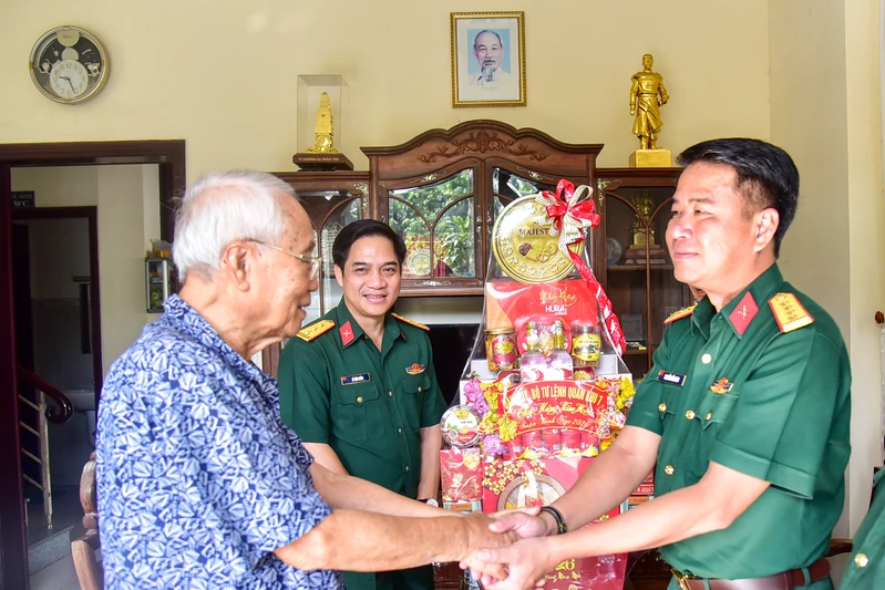 Đại tá Nguyễn Tấn Linh, Phó Tư lệnh Quân khu chúc Tết Trung tướng Nguyễn Văn Nam, nguyên Phó Tư lệnh Quân khu, nguyên Tư lệnh Bộ Tư lệnh Thành phố Hồ Chí Minh.