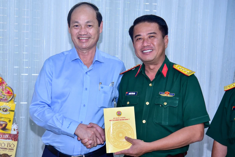 Đại tá Nguyễn Tấn Linh, Phó Tư lệnh Quân khu chúc Tết đồng chí Huỳnh Đảm, nguyên Ủy viên Ban Chấp hành Trung ương Đảng, nguyên Chủ tịch Ủy ban Trung ương MTTQ Việt Nam.