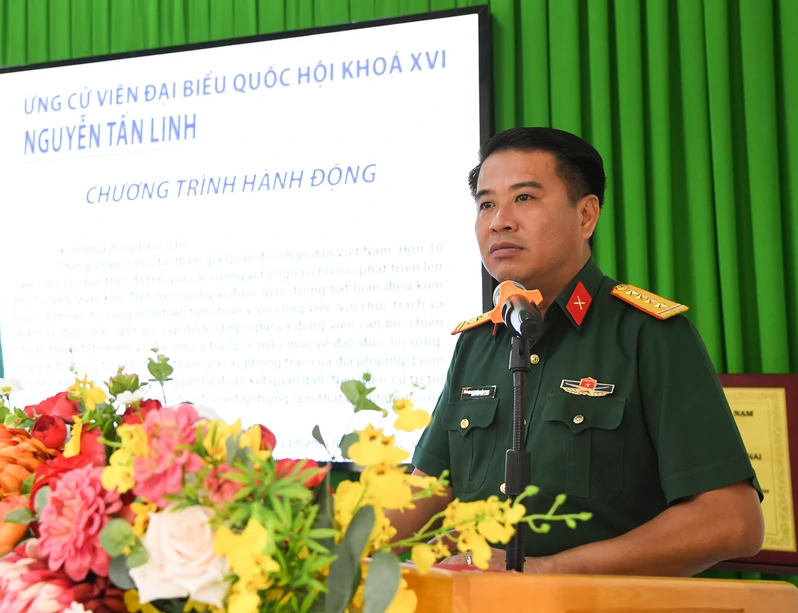 Đại tá Nguyễn Tấn Linh, Phó Tư lệnh Quân khu 7, ứng cử viên đại biểu Quốc hội khóa XVI trình bày chương trình hành động.