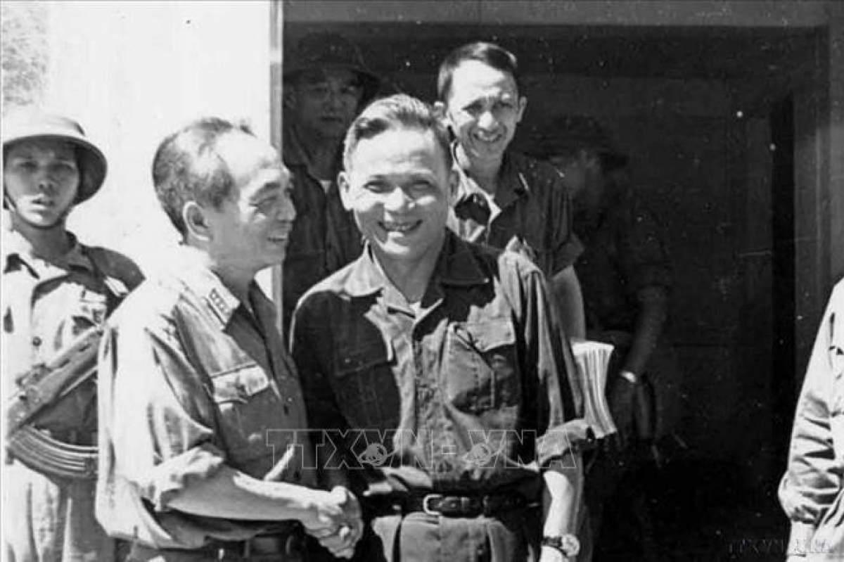 Thượng tướng Chu Huy Mân, nguyên Tư lệnh Quân giải phóng Quân khu 5 và Đại tướng Võ Nguyên Giáp tại Sở Chỉ huy Quân đoàn 1 Ngụy quyền Sài Gòn sau ngày thành phố Đà Nẵng được giải phóng (tháng 3/1975) (Ảnh tư liệu)