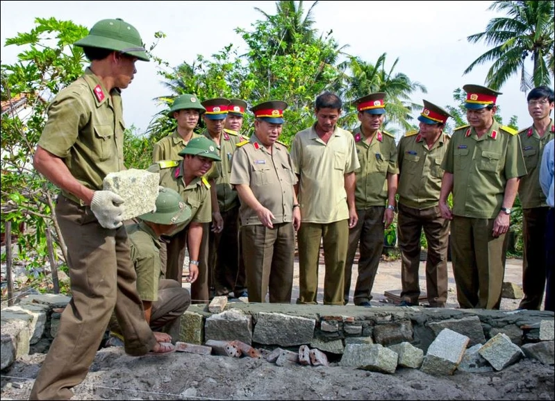 Thượng tướng Lê Văn Dũng, Bí thư Trung ương Đảng, Chủ nhiệm Tổng cục Chính trị đến thăm, kiểm tra cán bộ, chiến sĩ LLVT Quân khu 7 giúp Nhân dân dựng lại nhà sau cơn bão số 9 (Durian), năm 2006. Ảnh: XUÂN CƯỜNG