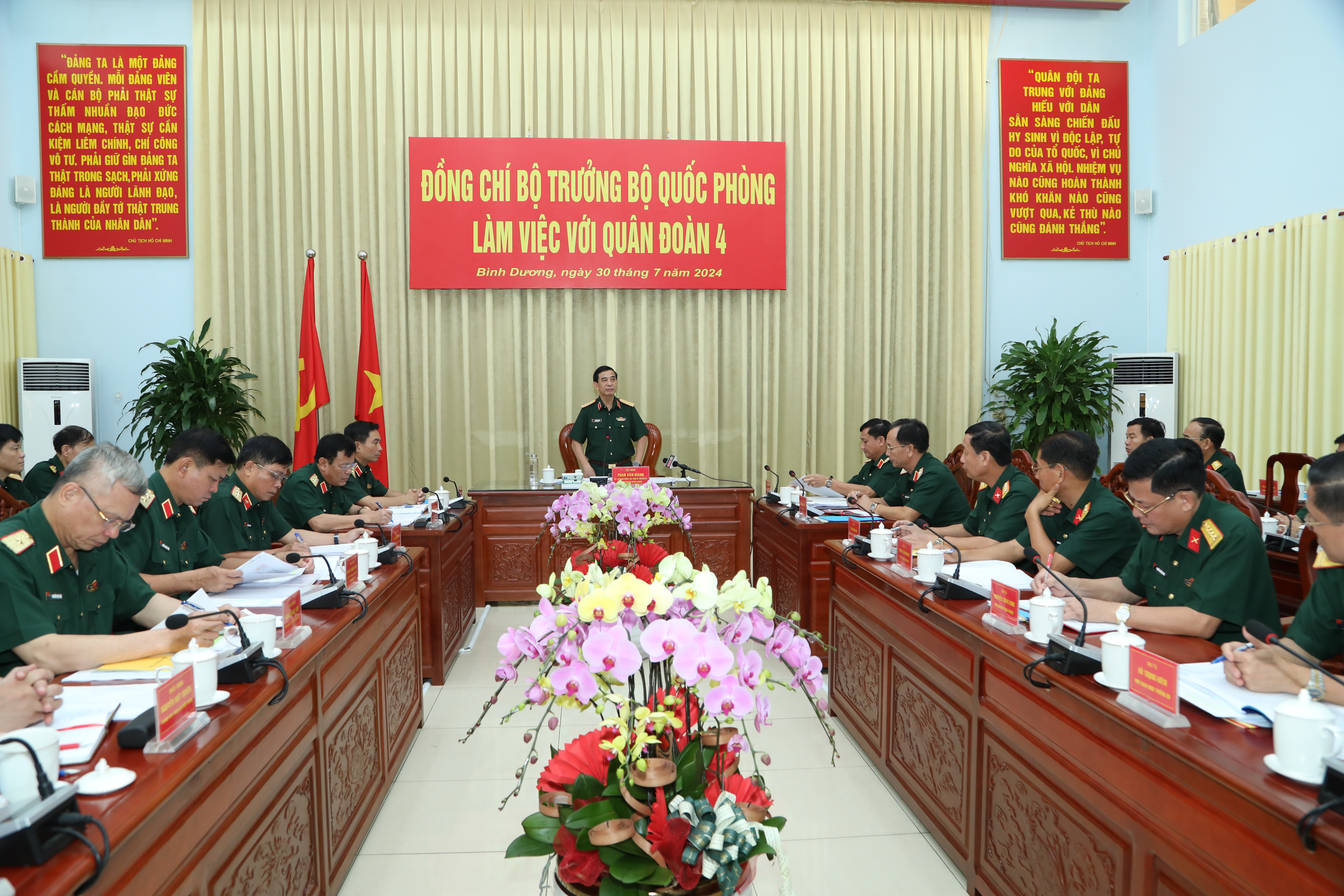 Phát biểu tại buổi làm việc, thay mặt Quân ủy Trung ương, Bộ Quốc phòng, Đại tướng Phan Văn Giang biểu dương những nỗ lực, cố gắng và kết quả đạt được của Quân đoàn 4 trong 50 năm qua. Đồng chí Bộ trưởng Bộ Quốc phòng nhấn mạnh, Quân đoàn 4 cần nhận thức rõ những thuận lợi, khó khăn, tổ chức triển khai thực hiện tốt các nhiệm vụ được giao, phấn đấu hoàn thành thắng lợi nhiệm vụ 6 tháng cuối năm 2024. Đại tướng Phan Văn Giang yêu cầu Quân đoàn 4 cần quan tâm giáo dục tư tưởng cho cán bộ, chiến sĩ yên tâm công tác; làm tốt công tác chính sách, chăm lo tới đời sống cán bộ, chiến sĩ, đặc biệt là những trường hợp gia đình quân nhân khó khăn; tăng cường quan hệ với chính quyền địa phương, đảm bảo an ninh chính trị, trật tự an toàn xã hội.