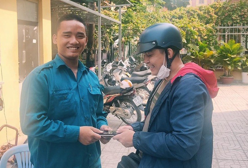 Đồng chí Ngô Văn Hùng (bên trái) trả lại điện thoại cho người đánh rơi.