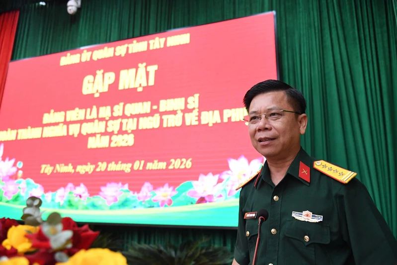 (QK7 Online) - Ngày 20/1, Đảng ủy, Bộ Chỉ huy Quân sự (CHQS) tỉnh Tây Ninh tổ chức gặp mặt, giao nhiệm vụ cho đảng viên là hạ sĩ quan, binh sĩ chuẩn bị hoàn thành nghĩa vụ quân sự, xuất ngũ trở về địa phương năm 2026. Dự và chỉ đạo buổi gặp mặt có Đại tá Nguyễn Thanh Phong, Phó Bí thư Thường trực Đảng ủy Quân sự tỉnh, Chính ủy Bộ CHQS tỉnh. Tham dự buổi gặp mặt còn có lãnh đạo các sở, ban, ngành tỉnh; Trường Đại học Kinh tế Công nghiệp Long An; chỉ huy các cơ quan, đơn vị và 105 đồng chí đảng viên xuất ngũ năm 2026.