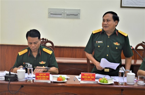 Thiếu tướng Nguyễn Văn Hiệu, Bí thư Đảng ủy Cục Chính trị duy trì và điều hành thảo luận tại hội nghị.