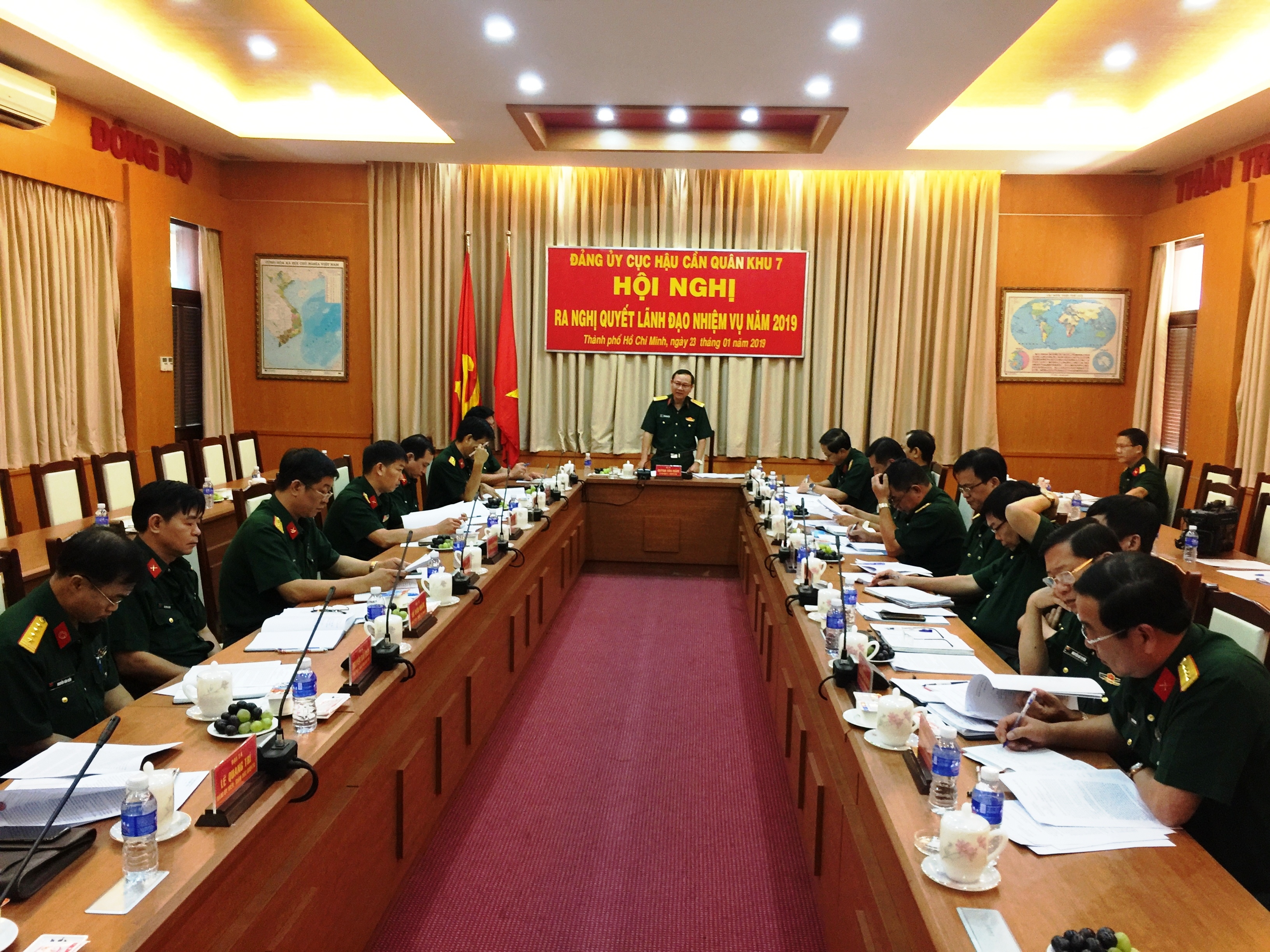(QK7 Online ) - Ngày 23 tháng 1, Đảng ủy Cục Hậu cần tổ chức hội nghị ra Nghị quyết lãnh đạo năm 2019, Thiếu tướng Võ Văn Thi, Phó Tư lệnh Quân khu 7 đến dự; Đại tá Huỳnh Văn Mầm, Bí thư Đảng ủy, Chính ủy Cục Hậu cần chủ trì hội nghị.