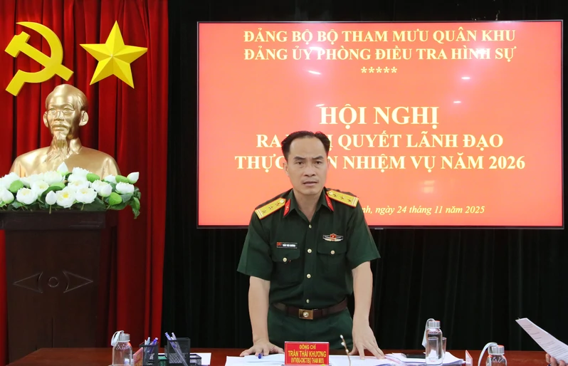 (QK7 Online) - Chiều 24/11, tại Thành phố Hồ Chí Minh, Đảng ủy Phòng Điều tra hình sự Quân khu tổ chức Hội nghị ra nghị quyết lãnh đạo thực hiện nhiệm vụ năm 2026. Thượng tá Trần Thái Khương, Ủy viên thường vụ Đảng ủy, Chủ nhiệm Chính trị Bộ Tham mưu Quân khu dự, chỉ đạo hội nghị.