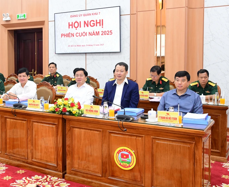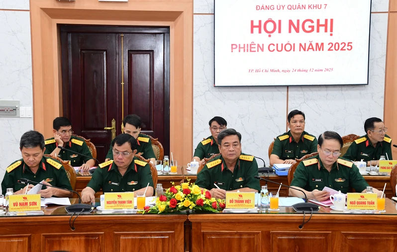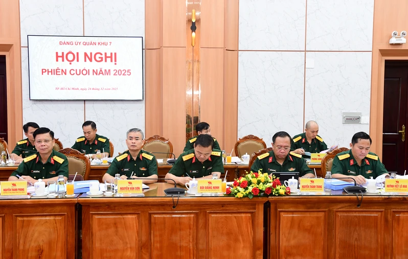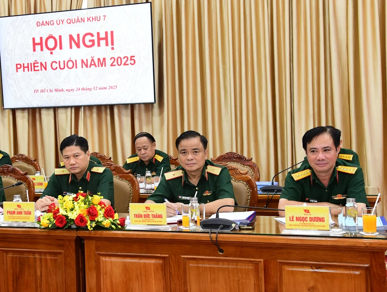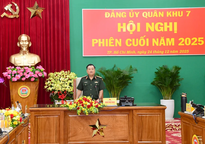 (QK7 Online) - Ngày 24/12, Đảng ủy Quân khu 7 tổ chức hội nghị phiên cuối năm đánh giá kết quả lãnh đạo triển khai thực hiện nhiệm vụ quân sự, quốc phòng năm 2025, ra Nghị quyết lãnh đạo thực hiện nhiệm vụ năm 2026. Trung tướng Trần Vinh Ngọc, Bí thư Đảng ủy, Chính ủy Quân khu chủ trì hội nghị.
