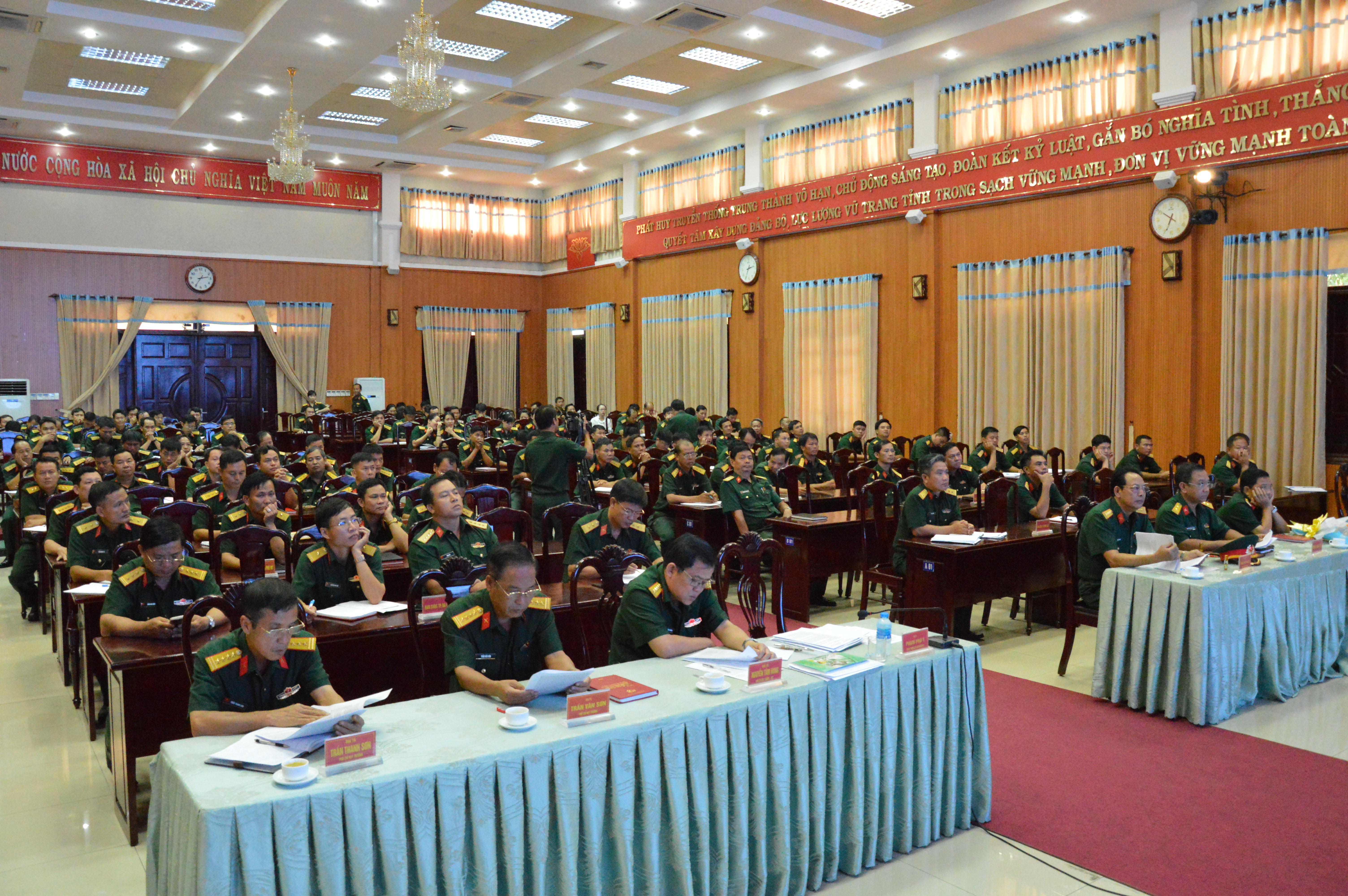 Tại hội nghị các cán bộ, đảng viên thuộc Đảng bộ Quân sự tỉnh được quán triệt một số nội dung cơ bản: Đề cương các dự thảo Văn kiện Đại hội XIII của Đảng; Tổng kết thực hiện Chỉ thị số 36-CT/TW của Bộ Chính trị khóa XI về Đại hội Đảng bộ các cấp, tiến tới Đại hội đại biểu toàn quốc lần thứ XII của Đảng và dự thảo Chỉ thị của Bộ Chính trị khóa XII về Đại hội Đảng bộ các cấp, tiến tới Đại hội đại biểu toàn quốc lần thứ XIII của Đảng; Báo cáo các công việc quan trọng Bộ Chính trị đã giải quyết từ sau Hội nghị Trung ương 9 khóa XII đến Hội nghị Trung ương 10 khóa XII; Báo cáo công tác kiểm tra, giám sát và kỷ luật Đảng trong năm 2018…