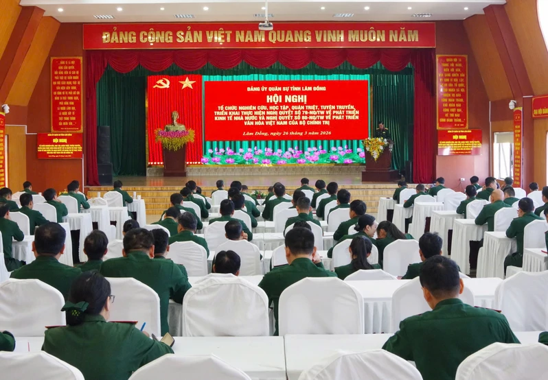 (QK7 Online) - Ngày 26/3, Đảng ủy Quân sự (CHQS) tỉnh Lâm Đồng tổ chức hội nghị tuyên truyền, phổ biến, học tập nội dung các Nghị quyết số 79, 80 của Bộ Chính trị và một số văn bản mới liên quan đến nhiệm vụ quân sự, quốc phòng. Đại tá Nguyễn Văn Sơn, Phó Bí thư thường trực Đảng ủy, Chính ủy Bộ CHQS tỉnh chủ trì hội nghị. Dự hội nghị có Thiếu tướng Đinh Hồng Tiếng, Ủy viên Ban thường vụ Tỉnh ủy, Chỉ huy trưởng Bộ CHQS tỉnh; các đồng chí trong Đảng ủy, Bộ CHQS tỉnh và toàn thể cán bộ, đảng viên.