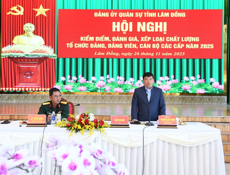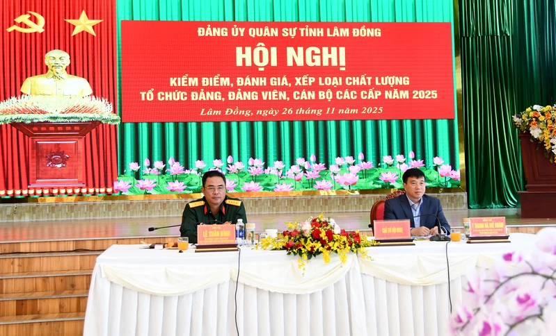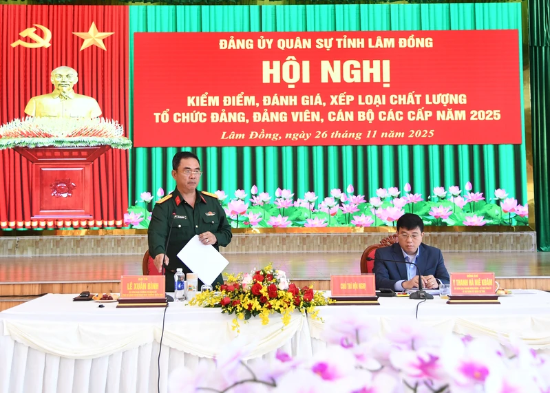(QK7 Online) - Sáng ngày 26/11, Ban Thường vụ Đảng ủy Quân sự (TVĐUQS) tỉnh Lâm Đồng tổ chức Hội nghị kiểm điểm, đánh giá và xếp loại chất lượng tổ chức đảng, đảng viên và đội ngũ cán bộ các cấp năm 2025. Đại tá Lê Xuân Bình, Ủy viên Thường vụ Đảng ủy Quân khu, Phó Tư lệnh, Tham mưu trưởng Quân khu 7 và đồng chí Y Thanh Hà Niê Kđăm, Ủy viên BCH Trung ương Đảng, Bí thư Tỉnh ủy, Bí thư Đảng ủy Quân sự tỉnh đồng chủ trì hội nghị. Tham dự hội nghị có Thủ trưởng Bộ Tham mưu, Cục Chính trị và Cục Hậu cần - Kỹ thuật Quân khu.