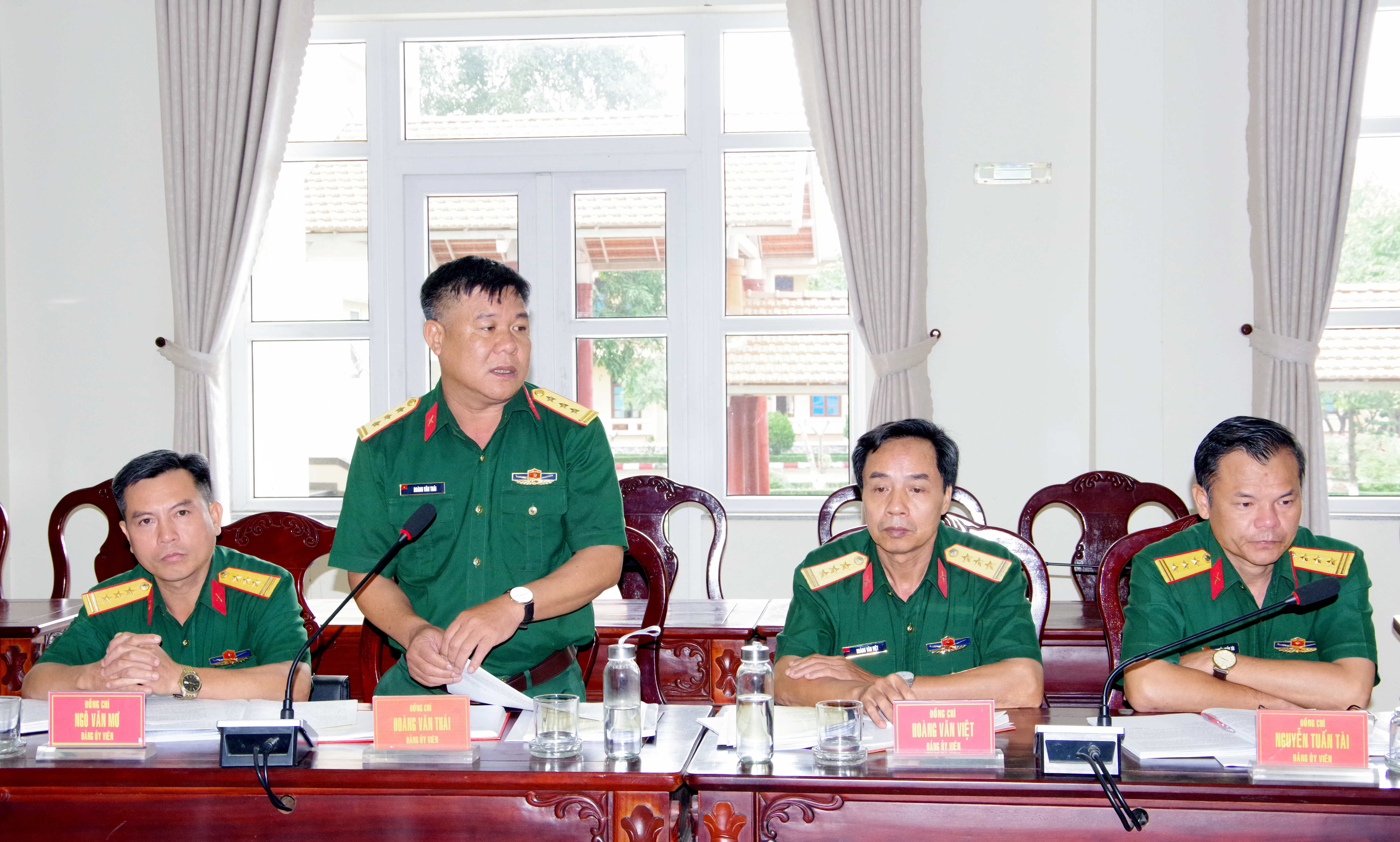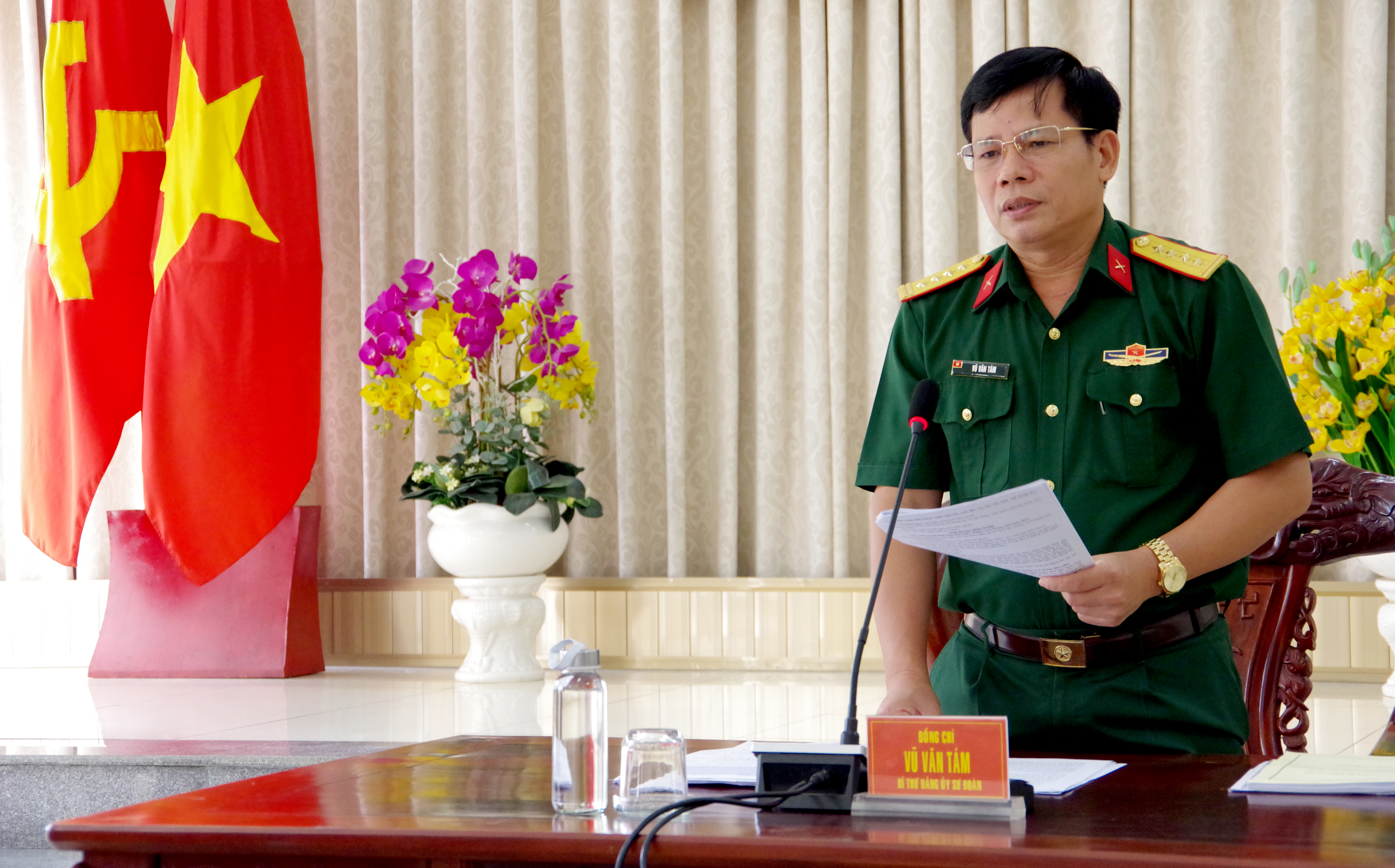 Đại tá Vũ Văn Tám, Bí thư Đảng ủy, Chính ủy Sư đoàn phát biểu tại hội nghị.