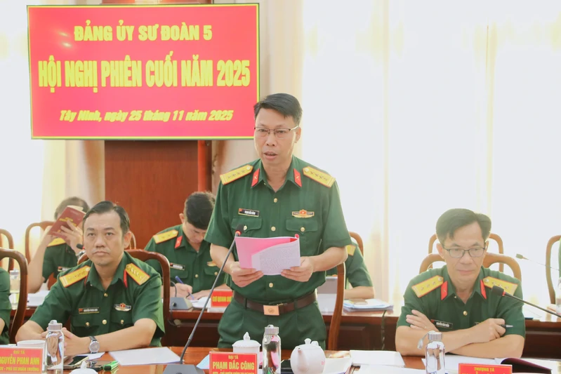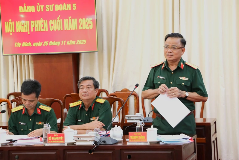 Phát biểu chỉ đạo tại hội nghị, Thiếu tướng Trần Đức Thắng biểu dương kết quả Sư đoàn 5 đạt được thời gian qua; đồng thời yêu cầu Đảng ủy Sư đoàn tiếp tục lãnh đạo, chỉ đạo sát thực tiễn; duy trì nghiêm chế độ huấn luyện, sẵn sàng chiến đấu; tăng cường quản lý, rèn luyện cán bộ, đảng viên, chiến sĩ về chính trị, đẩy mạnh Cuộc vận động “Phát huy truyền thống, cống hiến tài năng, xứng danh Bộ đội Cụ Hồ”; chủ động đấu tranh phòng, chống “diễn biến hòa bình” và phản bác các quan điểm sai trái, thù địch, thông tin xấu độc trên không gian mạng. Làm tốt công tác chuẩn bị và tổ chức huấn luyện; thực hiện 3 thực chất trong huấn luyện, điều hành, tổ chức huấn luyện chặt chẽ, an toàn; chuẩn bị chu đáo và tham gia các hội thi, hội thao phấn đấu đạt kết quả cao. Quán triệt, chấp hành nghiêm nguyên tắc, quy trình, quy chế công tác cán bộ; đào tạo, bồi dưỡng cán bộ đúng đối tượng, tiêu chuẩn, đáp ứng tốt nhu cầu sử dụng; điều động, bổ nhiệm, đề bạt, luân chuyển và chính sách cán bộ. Đẩy mạnh tăng gia sản xuất, tích cực ứng dụng khoa học công nghệ nâng cao hiệu quả kinh tế và bảo đảm đời sống bộ đội; chăm sóc tốt sức khỏe cán bộ, chiến sĩ theo phương châm “Tất cả vì chiến sỹ thân yêu”; bảo đảm tốt công tác hậu cần, kỹ thuật cho các nhiệm vụ thường xuyên, đột xuất. Chú trọng quán triệt sâu sắc và triển khai thực hiện nghiêm túc, hiệu quả nghị quyết Đại hội đại biểu toàn quốc lần thứ XIV; Đại hội Đảng bộ Quân đội lần thứ XII; Đại hội đại biểu Đảng bộ Quân khu 7 lần thứ XI và chỉ đạo của đồng chí Tổng bí thư Tô Lâm về 2 kiên định, 2 đẩy mạnh, 2 ngăn ngừa; quyết tâm chính trị cao từ đầu nhiệm kỳ, tạo động lực mạnh mẽ hoàn thành thắng lợi các mục tiêu, chỉ tiêu, nhiệm vụ và khâu đột phá.