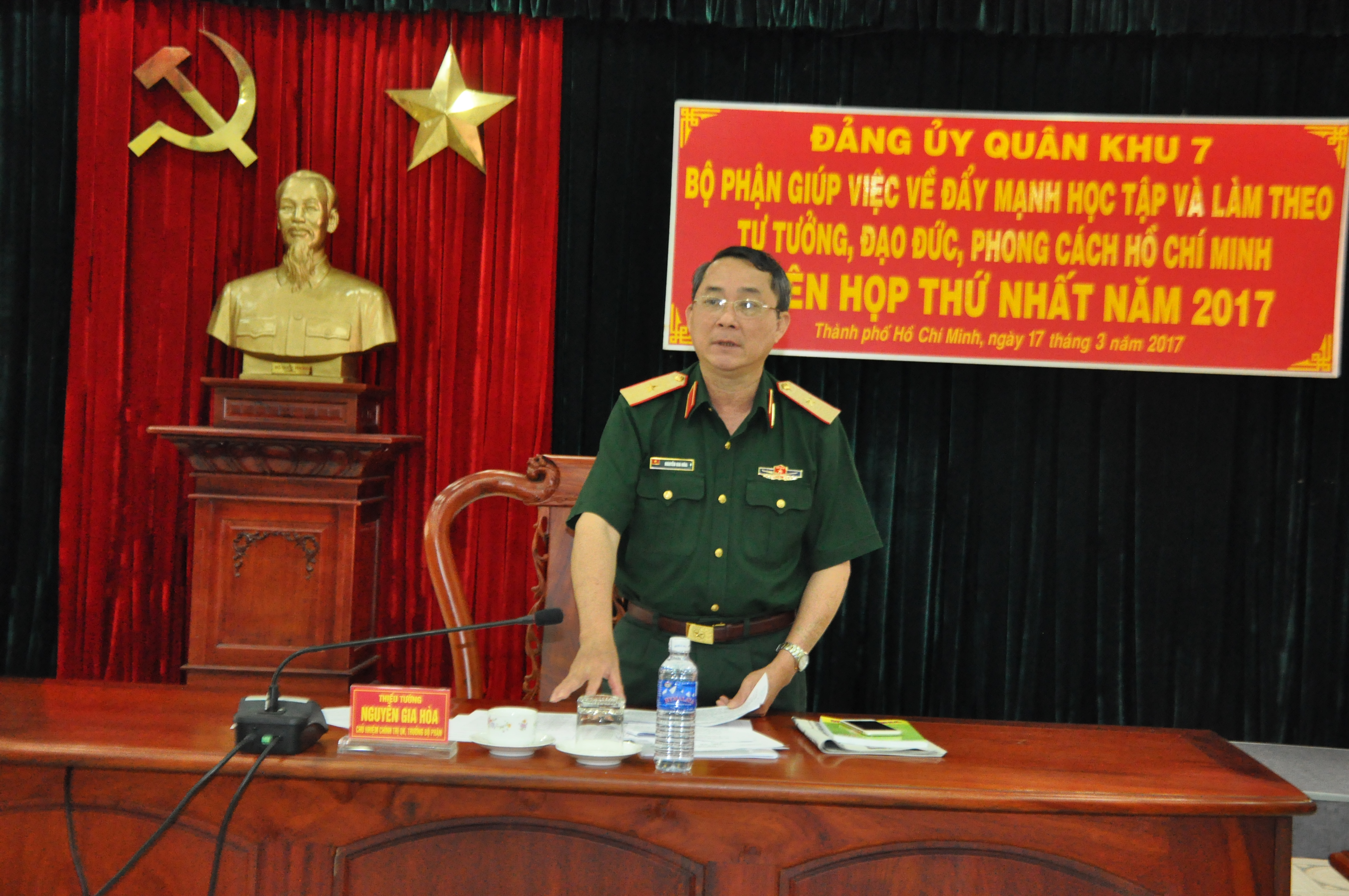 Học tập và làm theo tư tưởng, đạo đức, phong cách Hồ Chí Minh phải xuyên suốt, cụ thể, thường trực, là việc làm hàng ngày của mọi cán bộ, chiến sĩ trong LLVT Quân khu 7. Đó là phát biểu chỉ đạo của Thiếu tướng Nguyễn Gia Hòa, Ủy viên Thường vụ Đảng ủy Quân khu, Chủ nhiệm Chính trị Quân khu, Trưởng Bộ phận giúp việc về đẩy mạnh học tập và làm theo tư tưởng, đạo đức, phong cách Hồ Chí Minh của Đảng ủy Quân khu tại hội nghị Bộ phận giúp việc thực hiện Chỉ thị số 05 của Bộ Chính trị và Chỉ thị số 87 của Thường vụ Quân ủy Trung ương về đẩy mạnh học tập và làm theo tư tưởng, đạo đức, phong cách Hồ Chí Minh trong Đảng bộ, LLVT Quân khu diễn ra ngày 17/3.