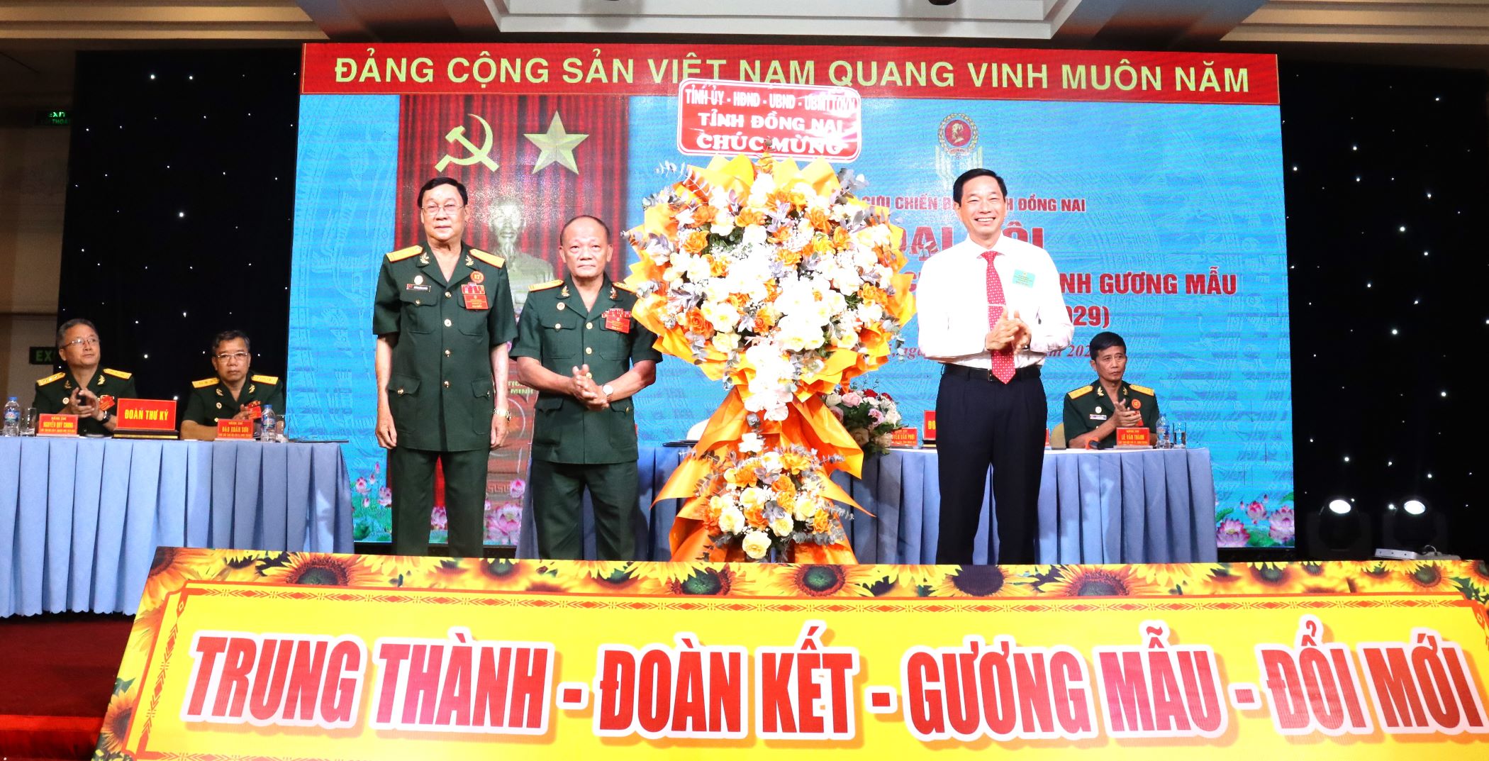 Thiếu tướng Trần Đình Hướng tặng Cờ thi đua xuất sắc của Trung ương Hội Cựu chiến binh Việt Nam cho Hội Cựu chiến binh tỉnh Đồng Nai.