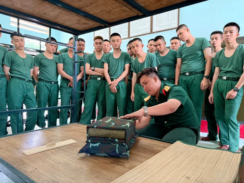 Cán bộ hướng dẫn chiến sĩ gấp chăn màn.
