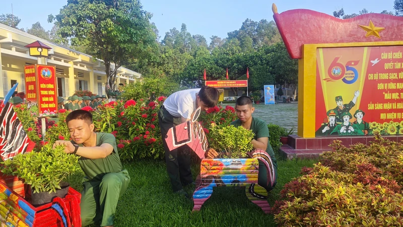 Chiến sĩ mới chăm sóc cảnh quan môi trường đơn vị.