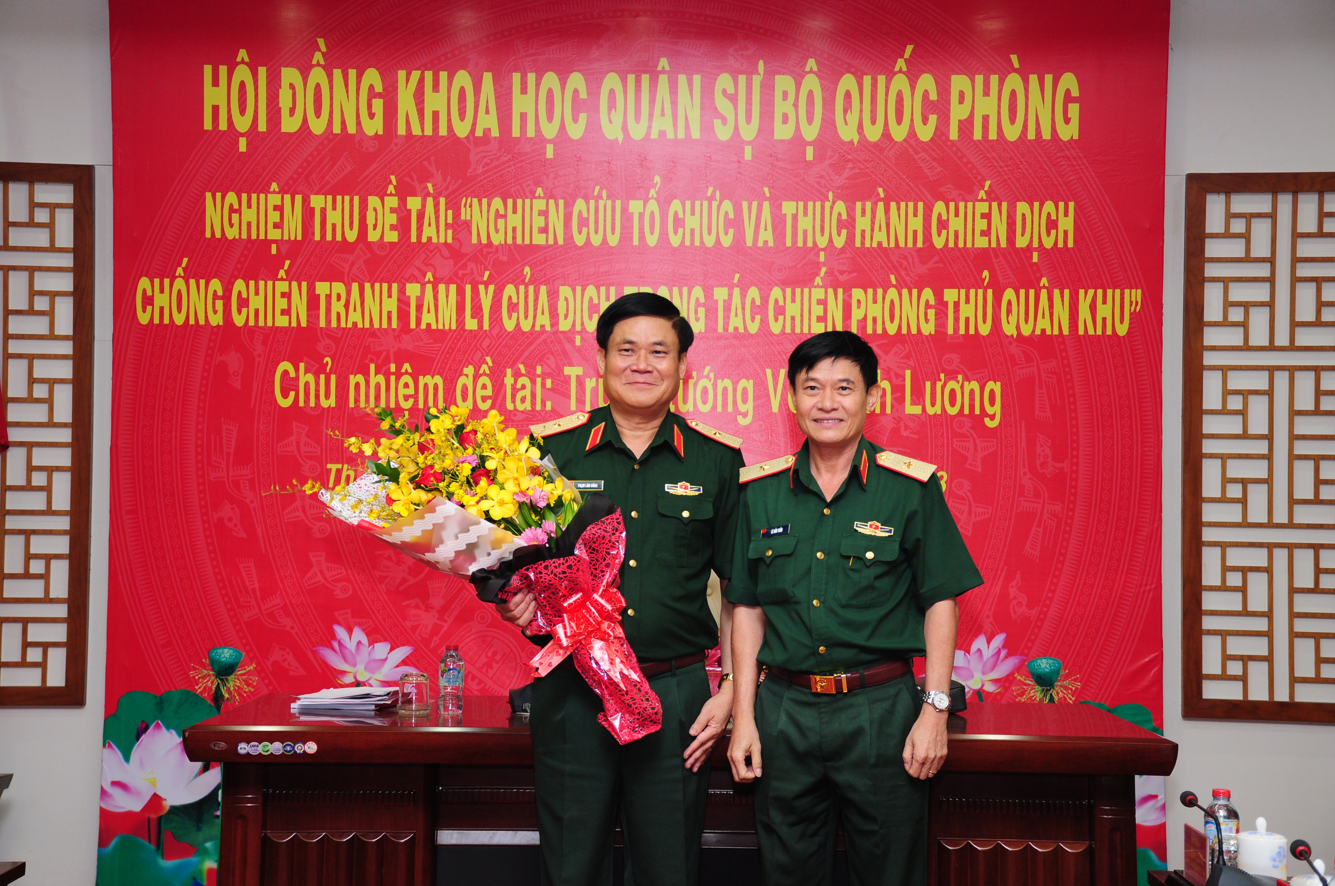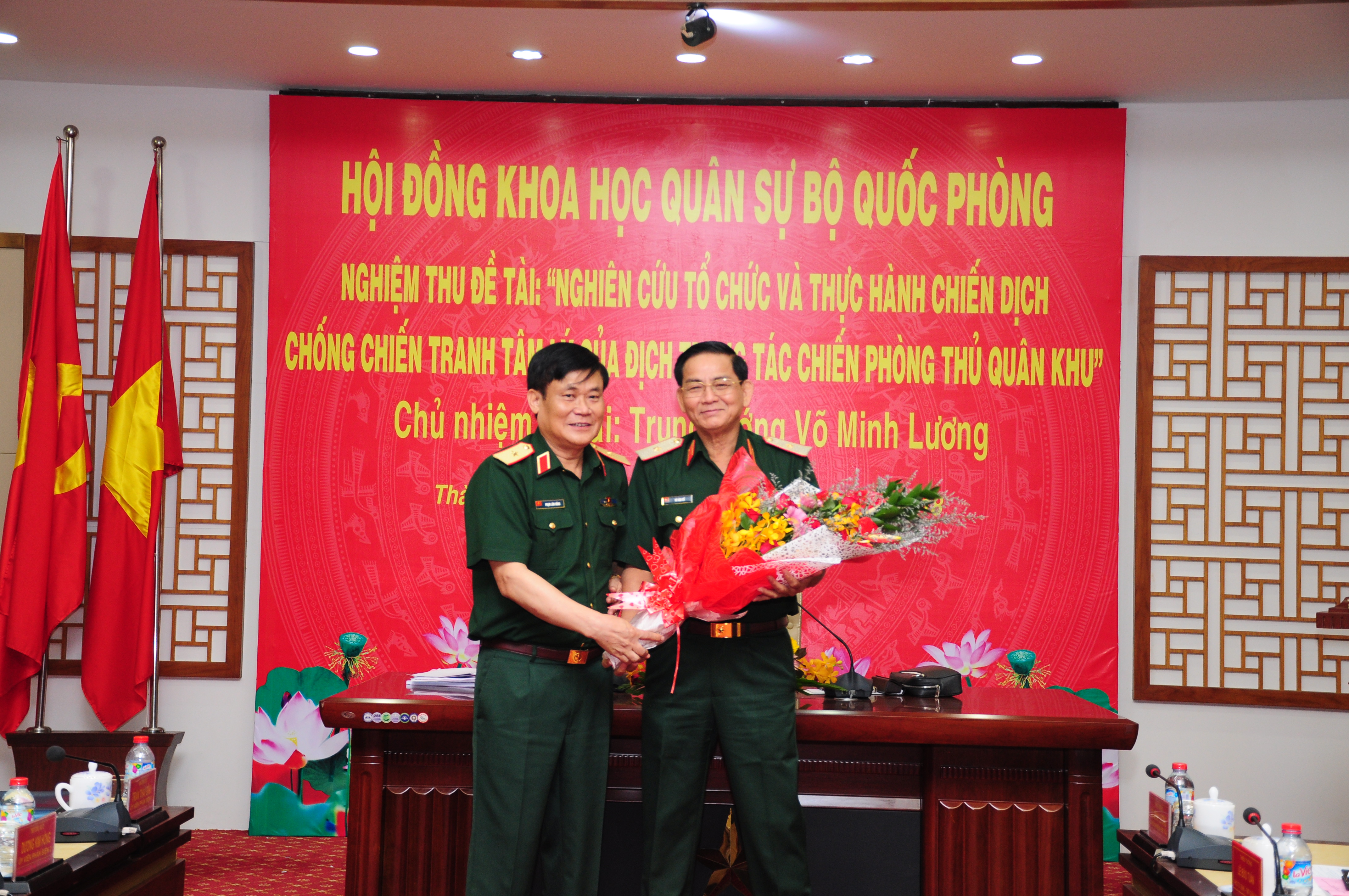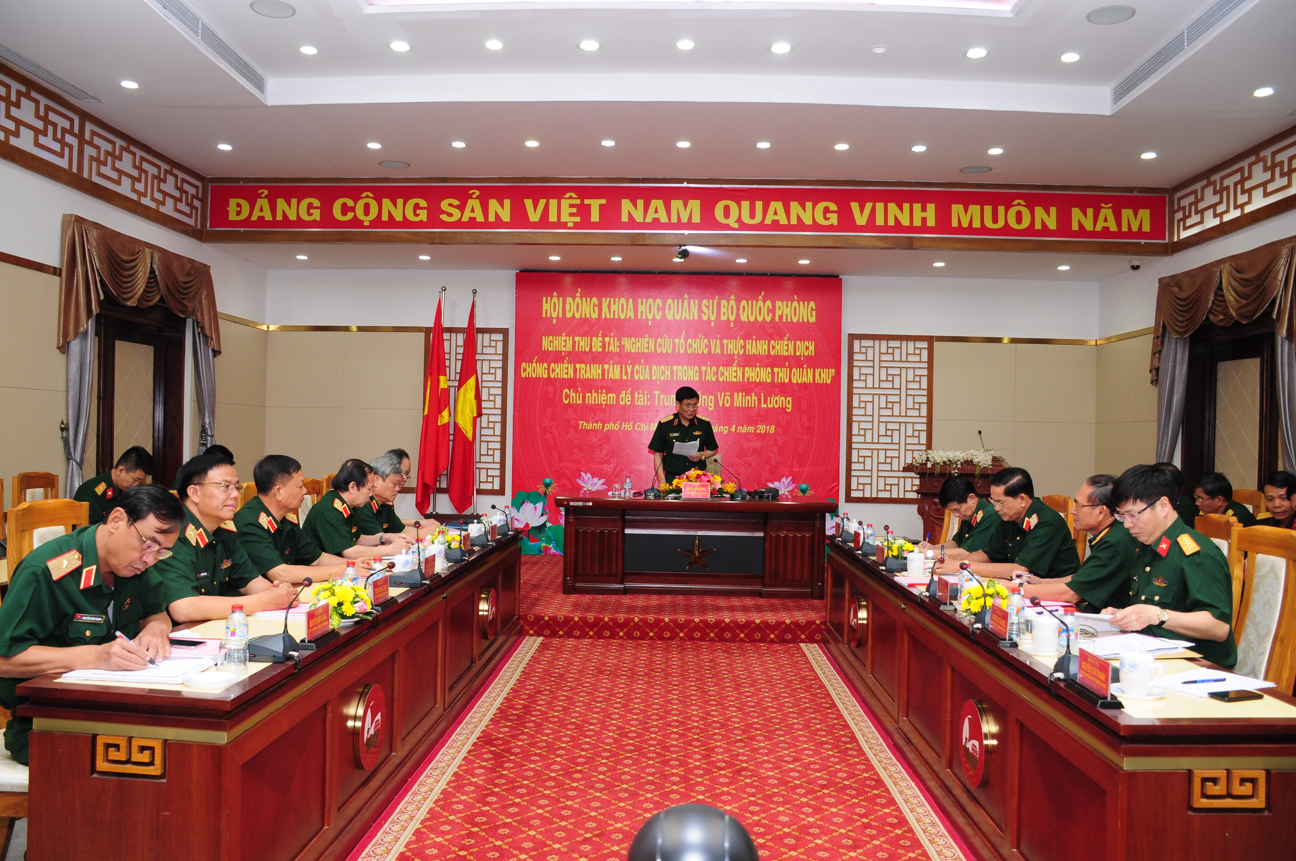 Các thành viên trong hội đồng phản biện, nhận xét và đánh giá cao đề tài “Nghiên cứu tổ chức và thực hành chiến dịch chống chiến tranh tâm lý của địch trong tác chiến phòng thủ Quân khu” do Trung tướng Võ Minh Lương, UVTW Đảng, Tư lệnh Quân khu làm chủ nhiệm đề tài. Đây là đề tài mới, nghiên cứu chặt chẽ, thống nhất, có tính cấp thiết cao, bố cục hợp lý, đưa ra hệ thống lý luận mới, thể hiện đúng đường lối, quan điểm của Đảng và Nhà nước trong chiến tranh bảo vệ Tổ quốc trong tình hình mới.