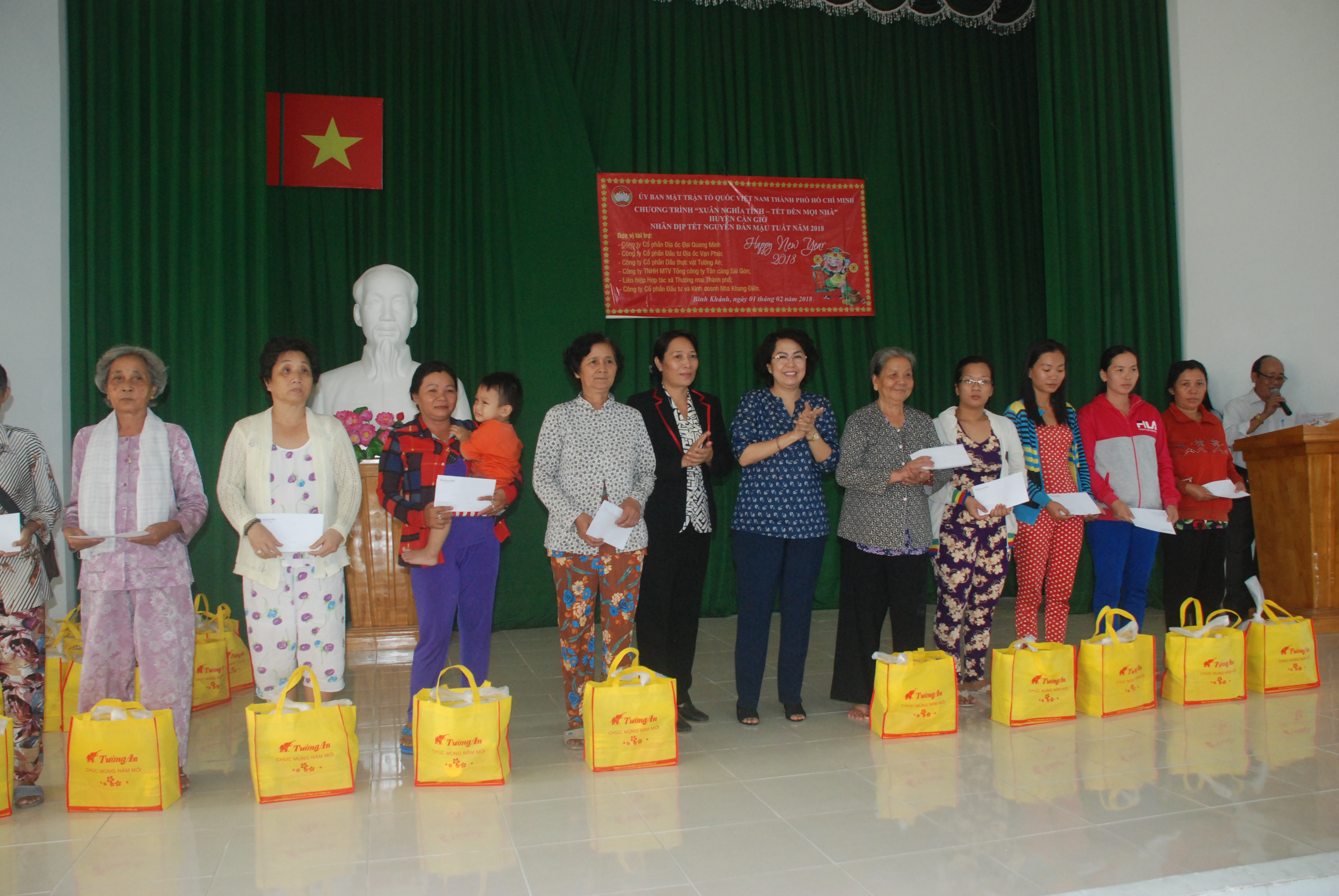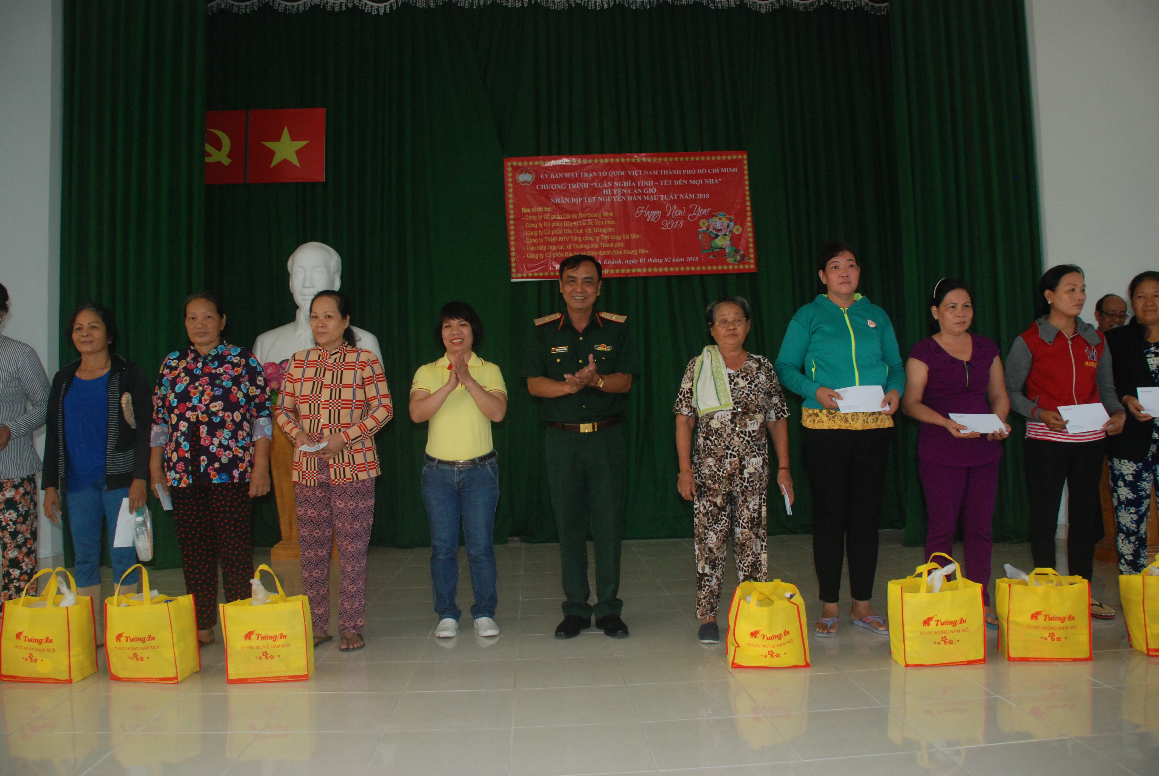 Theo báo cáo của lãnh đạo xã thì hiện nay trên địa bàn toàn xã còn có hơn 2 ngàn hộ dân thuộc diện hộ nghèo và cận nghèo, trong năm qua đời sống bà con nhân dân trong xã gặp nhiều khó khăn do nguồn thu nhập của người dân ngày càng thấp. Trong đợt này, Ủy ban Mặt trận Tổ quốc Tp. Hồ Chí Minh, tổ đại biểu Quốc hội đã vận động các nhà tài trợ được 600 suất quà để trao tặng cho bà con, phần quà là những vật dụng thiết yếu trong sinh hoạt gia đình như gạo, dầu ăn, bột ngọt... kèm theo là 200 ngàn tiền mặt.
