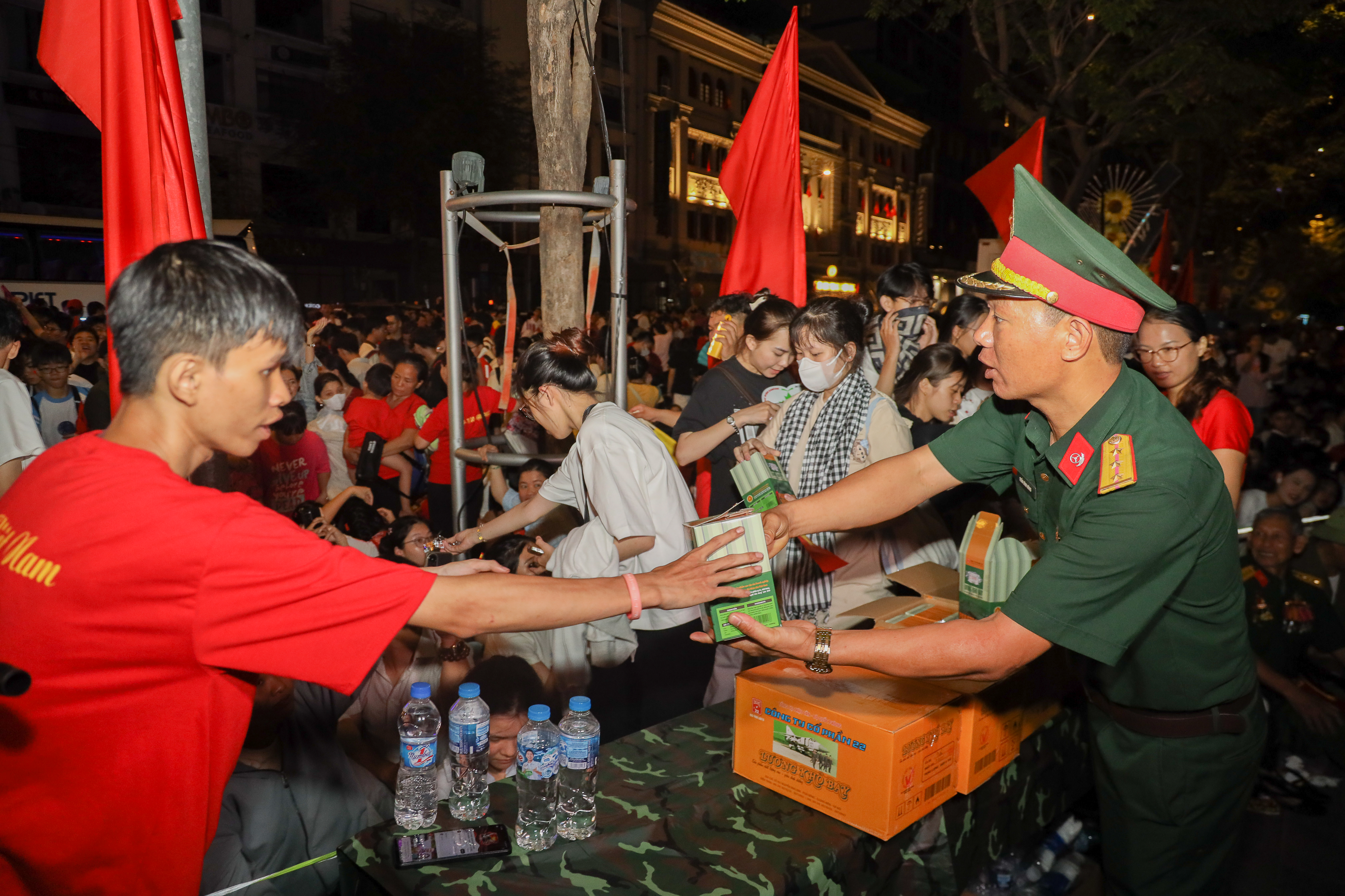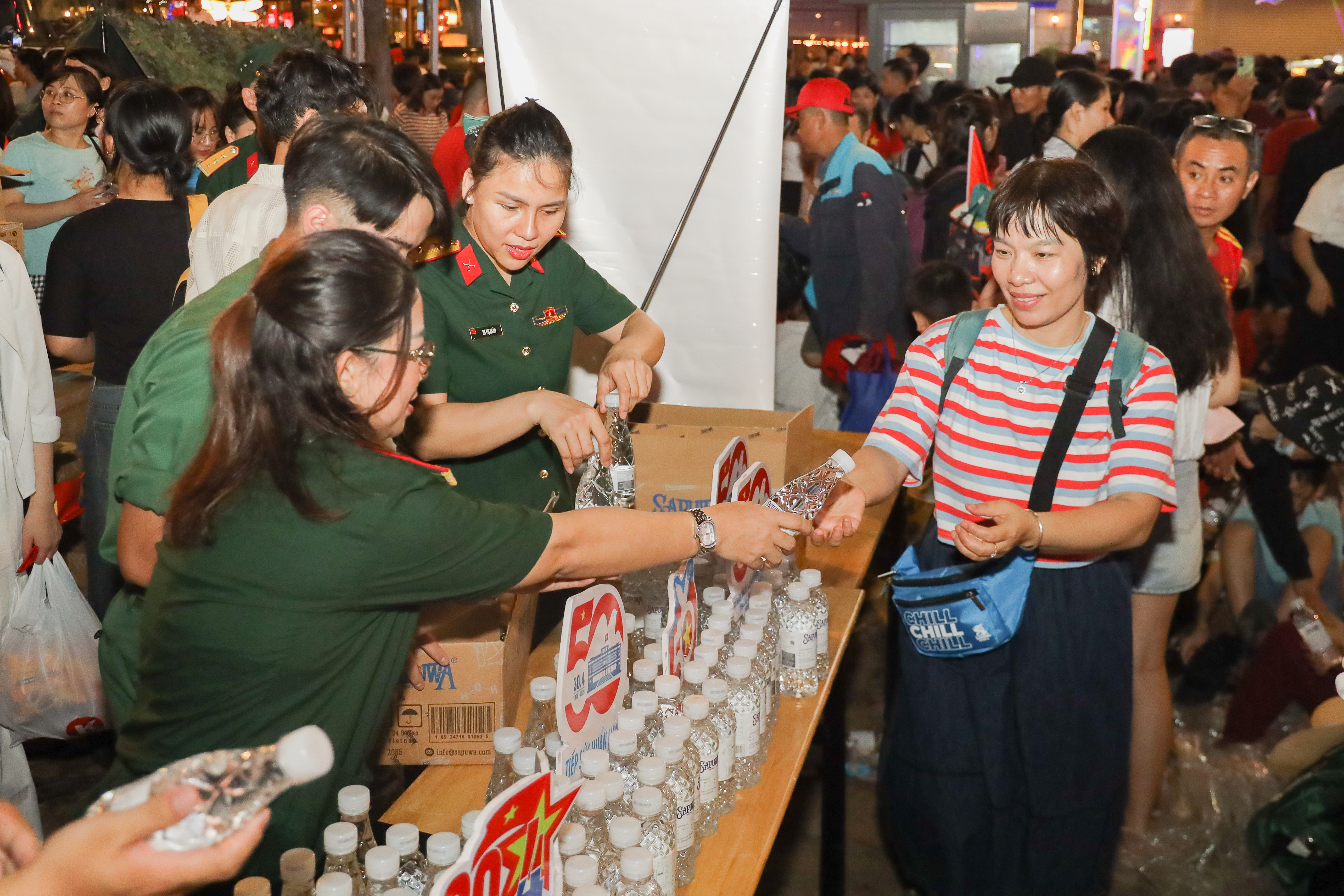 Hàng nghìn chai nước được phát đi không chỉ là món quà nhỏ, mà còn là tình cảm ấm áp, sẻ chia giữa bộ đội và Nhân dân trong thời khắc ý nghĩa của đất nước.