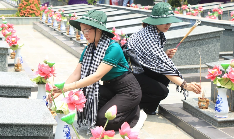 Thành viên trong đoàn công tác thắp hương tri ân từng phần mộ liệt sĩ.